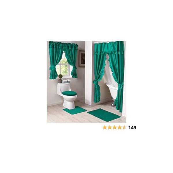 Star lite Deluxe Swag ruffled Shower Curtain will update and beautify your bath’s decor. Jacquard woven diamonds will shimmer like a reflection on a clear pool. Star lite is made from water resistant polyester fabric. Set includes a liner, two easy to attach tieback hooks, and two ruffled tiebacks. Coordinating 63″ ruffled window curtain is also available.