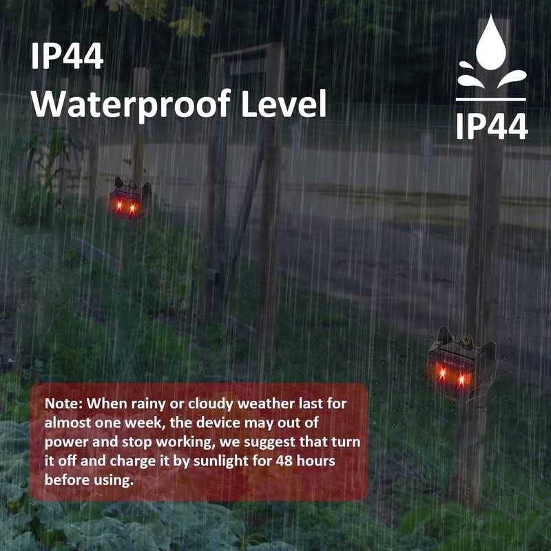 Description MAGIC CAT animal repellent is designed to deter nocturnal animals by flashing red light based on the theory that warm-blooded animals are afraid of fire. Forget the harmful chemical, poison, and traps typically used in households, just hanging this device at proper position and turn it on by pressing the button. It’s a humane way to deter skunk, deer, fox, wolf, coyote, rabbit, owl, raccoon and most of other wild animals. The red lights will flash all night to keep your property safe. Specification Product Name: Solar Animal Repellent Brand: MAGIC CAT Color: Black Waterproof Level: IP44 Model Number: AR17S Power supply: Solar powered 1.2V 8mA Operating Wattage: 0.0096W Product weight: 12 ounce Dimension: 7.3 x 2.68 x 3.6 inches Package includes: 4* Solar Animal Repellent 1* User Manual NOTE 1. The lights will blink at dusk to deter predators and turn off automatically for energy-saving after dawn by adopting the unique light sensor; 2. The red lights only blink when in dark environment such as at night. You can test whether it can operate normally by covering the solar panel with your hand at daytime; 3. This device only works at night or rainy days. When it’s working, the twin red colored LED lights blink rapidly at a frequency of 4Hz, which is similar to flickering flames; 4. For Best Results, remove all attractants like pet food, bird feeders, and fallen fruit are all tempting targets for unwanted animals; 5. Mount the unit depending on the eye height of the predator you want to deter. Mount 1 to 8 feet above the ground on a post, fence, or exterior of a wall; 6. Secure trash cans with tie-downs, place bird feeders out of reach, and ensure that chicken coops and pens are locked at night;