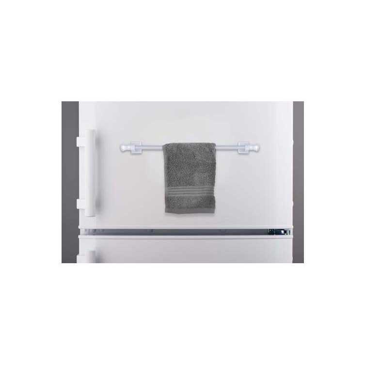 The Mainstays Cameron 7/16 inch Adjustable Multi-Use Magnetic Drapery Rod will attach securely to any steel surface with no-tools required. Designed for multi-purpose use, the Mainstays Cameron 7/16 inch Adjustable Multi-Use Magnetic Drapery Rod features a superior hold, new and improved bracket design, and is suitable for installation on doors, window casings, file cabinets, toolboxes, and appliances such as refrigerators, dishwashers, washers, and dryers. The rod easily adjusts from 16 to 28 inches and can be used to hang lightweight linens such as window valences and hand towels, up to 4 pounds. The Mainstays Cameron 7/16 inch Adjustable Multi-Use Magnetic Drapery Rod has a silver finish with matching plastic magnetic mounts. Note: Peel white paper backing off of clear adhesive magnet covering before use. Do not remove clear adhesive magnet covering- this feature allows for positioning and protects surface. Some stainless steel used in household appliances is non-magnetic.