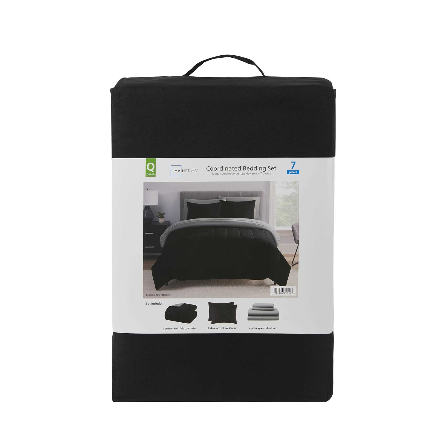 The Mainstays Bed in a Bag comes with everything you need to add the perfect pop to your bedroom space. Twin size includes; Comforter (66 inch x 90 inch), Flat Sheet (66 inch x 96 inch), Fitted Sheet (39 inch x 80 inch x 12 inch),1 Sham (20 inch x 26 inch), 1 Pillowcase (20 inch x 30 inch). Available in Twin, Full, Queen, and King sizes.