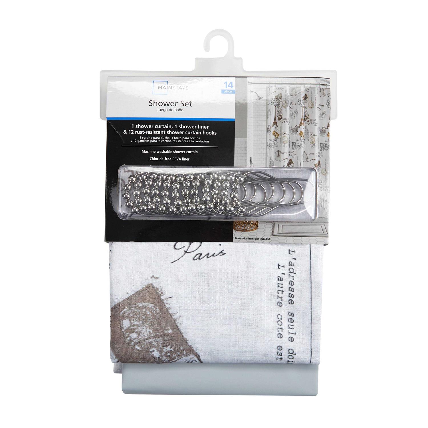 This beautiful and elegant Mainstays 14 Piece Gray Paris Printed Faux Linen 72 inch x 70 inch Shower Set with Hooks and Liner is a perfect way to update your bathroom dcor. The soft and neutral tones makes for a perfect way to match most color palettes and other bath dcor. This Mainstays 14 Piece Gray Paris Printed Faux Linen 72 inch x 70 inch Shower Set with Hooks and Liner offers an luxurious appeal, and adds a touch of texture and flair to any space. This Mainstays 14 Piece Gray Paris Printed Faux Linen 72 inch x 70 inch Shower Set with Hooks and Liner includes 1 shower curtain, 12 Rollerball hooks, and 1 PEVA shower liner. The Liner is easy to maintain with mild soap and water. The 100% polyester microfiber construction gives this shower curtain a soft finish that is machine washable for convenience.