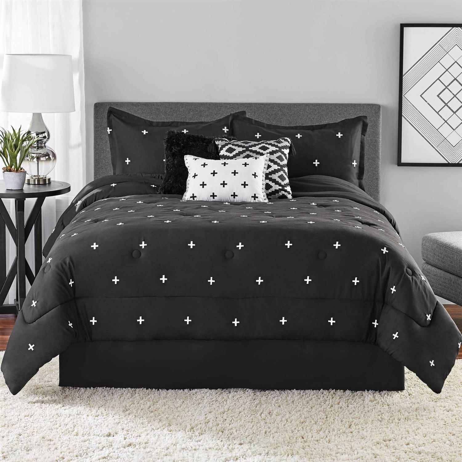 Bring a modern flair to the bedroom with the Mainstays Embroidered Cross 7 Piece Comforter Bedding Set. The microfiber comforter and shams flaunt mini embroidered white swiss crosses on a black background. Three decorative pillows with embroidered details long faux fur and/or embroidered flange and tassels coordinate beautifully with the top of the bed while the solid black bed skirt with a 14-inch drop provides a clean finish. Stunning and soft this embroidered swiss cross comforter set is machine washable for easy care.
