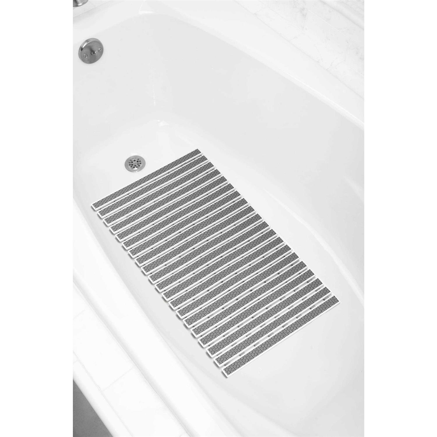 For added stability and comfort inside your bath or shower, add the Mainstays Rubber Multi-Surface Slatted Bath Mat in soft silver and white. This easy-to-install rubber bath mat fits in most tub and showers, and features a slatted design that provides comfort and better grip. The mat installs securely on multiple bath surfaces with slip-resistant suction cups. This product is treated with an agent to resist mildew. A soft silver and white finish allows the mat to fit in with almost any bath decor.