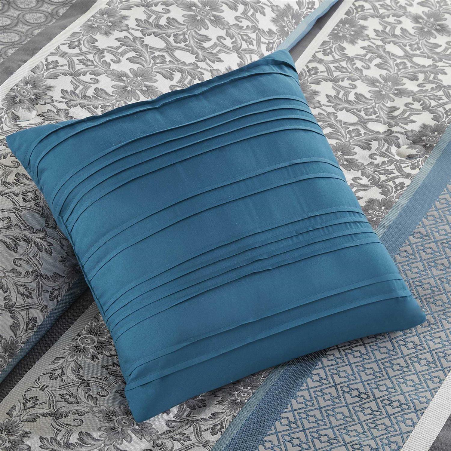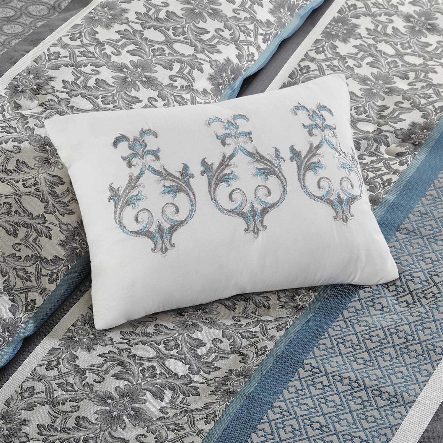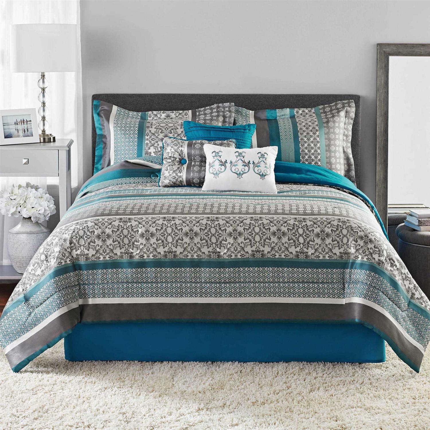 Brighten your bedroom with the Mainstays Princeton Stripe 7 Piece Comforter Bedding Set. The polyester jacquard comforter and matching shams feature a striped design with various geometric and solid patterns to create beautifully chic look. The solid reverse coordinates with the 14-inch drop solid bed skirt while three decorative pillows with embroidered details add the finishing touches. Eye-catching and soft this polyester jacquard comforter set offers a refreshing update to your bedroom dcor.