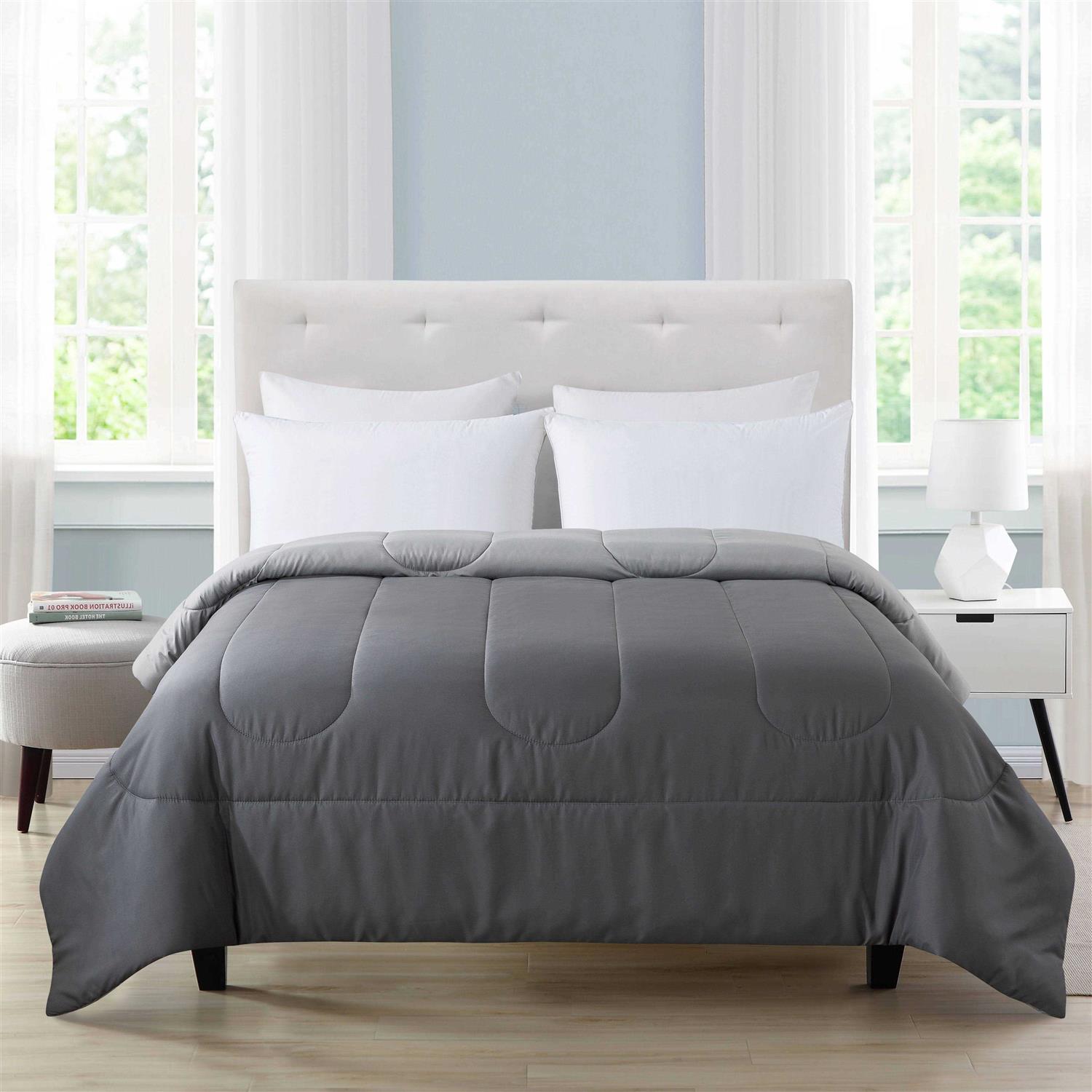 This classic all-season reversible comforter puts the comfort in comforter! Soft washed fabric gives the comforter an ultra soft and smooth hand feel. The down alternative filling provides extra warmth and softness, while the channel quilting keeps fill in place. The comforter features solid grey on front and matching lighter grey on reverse providing styling options and versatility. This Mainstays Comforter is machine washable and wrinkle resistant.
