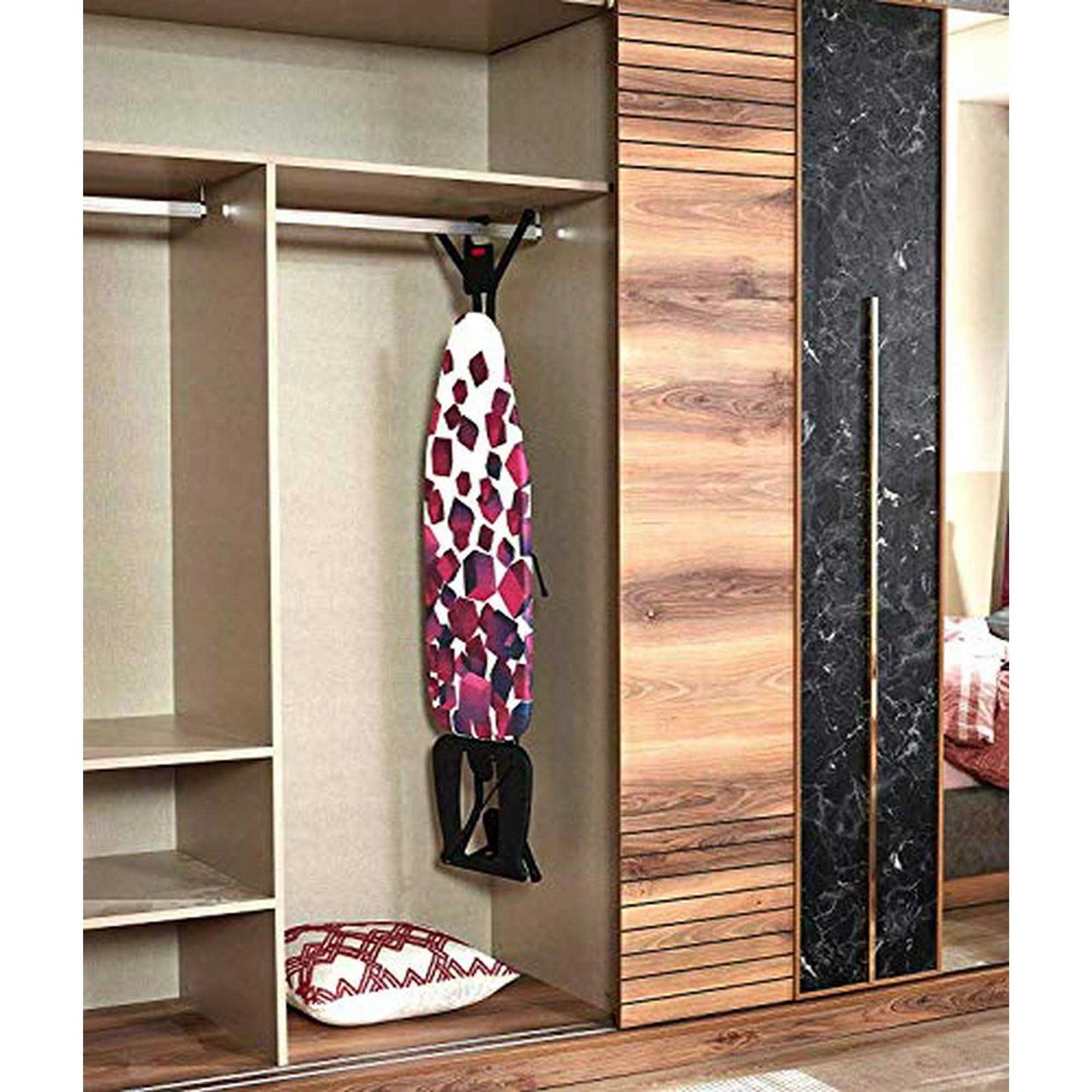 Size: 53×14″ Board Size (36×13″) it comes with the thick cover on it. , Oval 4 Leg it can be easily stored in your closet or wardrobe together with your iron on it, suitable for dorms, apartments,and smaller living spaces. No tool is necessary for storage. Hang it after strapping the iron when you are done. Silicone elastic band keeps your iron tightly wrapped in to the board. Handy transport lock keeps the table folded when stored or transported, Safety Lock: Prevents the board from accidently collapsing while in % Smooth Cotton Extra Thick Board Cover + Extra Cover included d-4 Different pre-set height settings. Minimum: 28.5″ – Maximum: 34.5 ” f-Safety Lock: Prevents the board from accidently collapsing while in use Size: 53×14″ Board Size (36×13″) it comes with the thick cover on it. , Oval 4 Leg it can be easily stored in your closet or wardrobe together with your iron on it, suitable for dorms, apartments,and smaller living spaces. No tool is necessary for storage. Hang it after strapping the iron when you are done. Silicone elastic band keeps your iron tightly wrapped in to the board. Handy transport lock keeps the table folded when stored or transported, Safety Lock: Prevents the board from accidently collapsing while in use 100% Smooth Cotton Extra Thick Board Cover + Extra Cover included