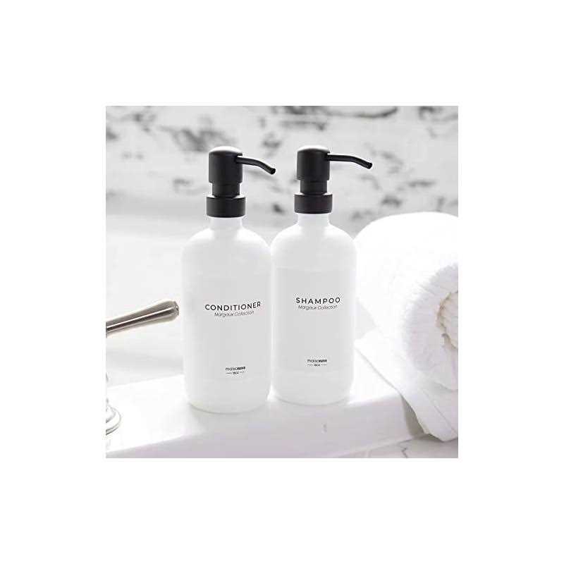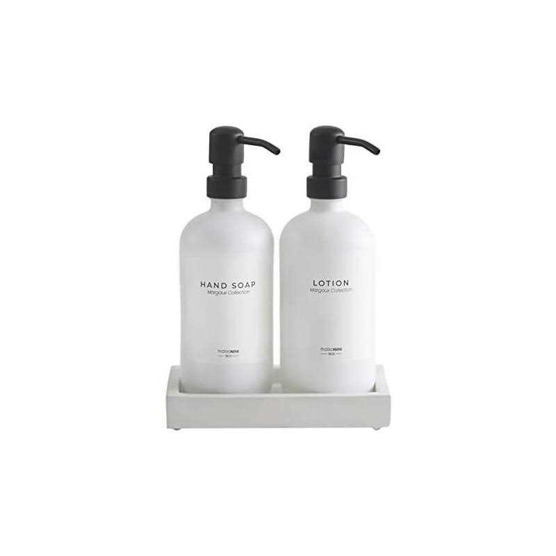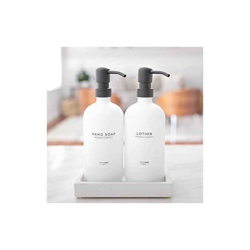 THIS PACK INCLUDES: 2 fortified White Bottles soap dispenser set with Black Pumps and Hand Soap Dispenser, Dish Soap, Lotion peel-n-stick waterproof labels for soap dispenser bathroom. A totally awesome bathroom soap dispenser set glass dispenser. QUALITY MATERIALS: Designed in USA and made with ISO14001 environmental standard, soap and lotion dispenser set and glass soap dispenser set feature fortified glass bottles, stainless steel metal pumps and soap pump dispenser, and multiple waterproof labels that endures humidity and heat. The best hand soap dispensers and bathroom soap dispenser set. IDEAL SOAP DISPENSER for BATHROOM or KITCHEN: mix-n-match with our labels and use it as for your glass soap dispenser set a dish soap and glass hand soap dispenser for kitchen sink or hand and dish soap dispenser set, lotion dispenser set for the bathroom and kitchen sink soap dispenser set. GREAT HOUSEWARMING GIFT: sturdy, durable and well-made glass soap dispenser bathroom with quality materials, this dish, and hand soap dispenser set makes perfect house warming gift as well as for self use. This soap pump bathroom soap dispenser and soap and lotion dispenser set with tray is made to last. 100% BRAND SATISFACTION: MaisoNovo is a Brooklyn-based, women-led small business that brings living to your homes with style.