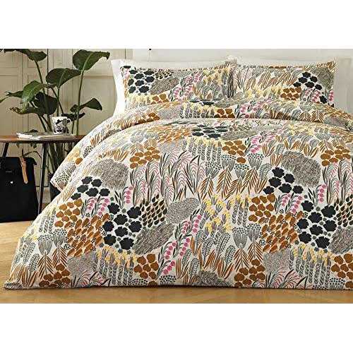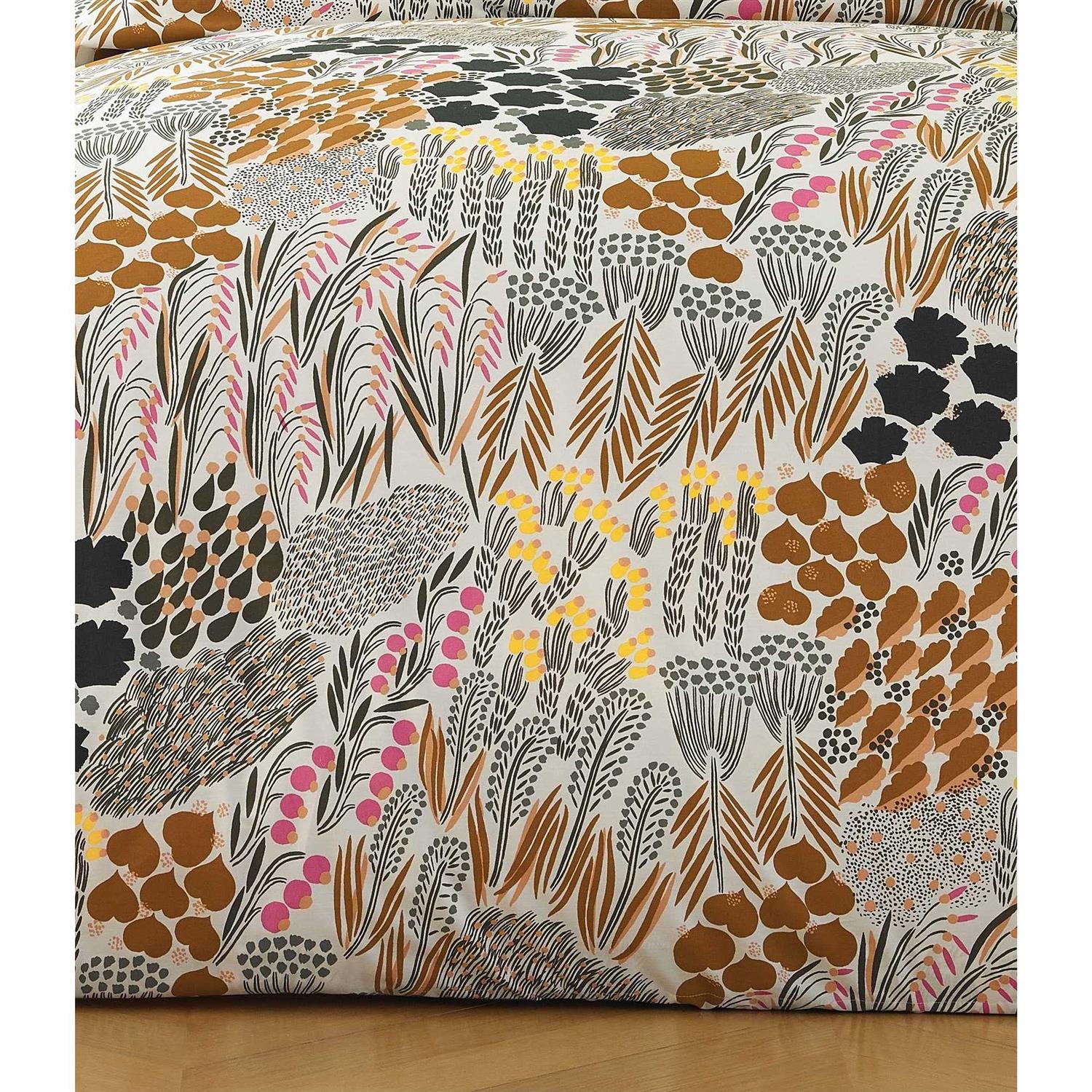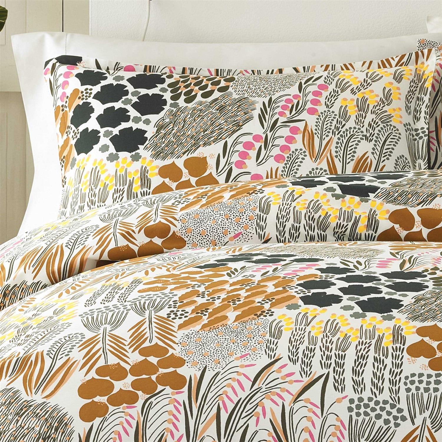 Choose from available sizes. Includes duvet cover and 1-2 shams. 200 thread count cotton. Floral motif. Brown, pink, and yellow colors. Machine wash cold. Inspired by the rich hues of an earthy lowland, the Pieni Letto Duvet Cover Set by Marimekko features a delicate floral design in shades of brown, pink, and yellow. The soft fabric is crafted from pure cotton with a thread count of 200 for a gentle feel. King duvet: 96L x 106W in. King sham: 20L x 36W in. Color: brown/pink/wash – 223999.