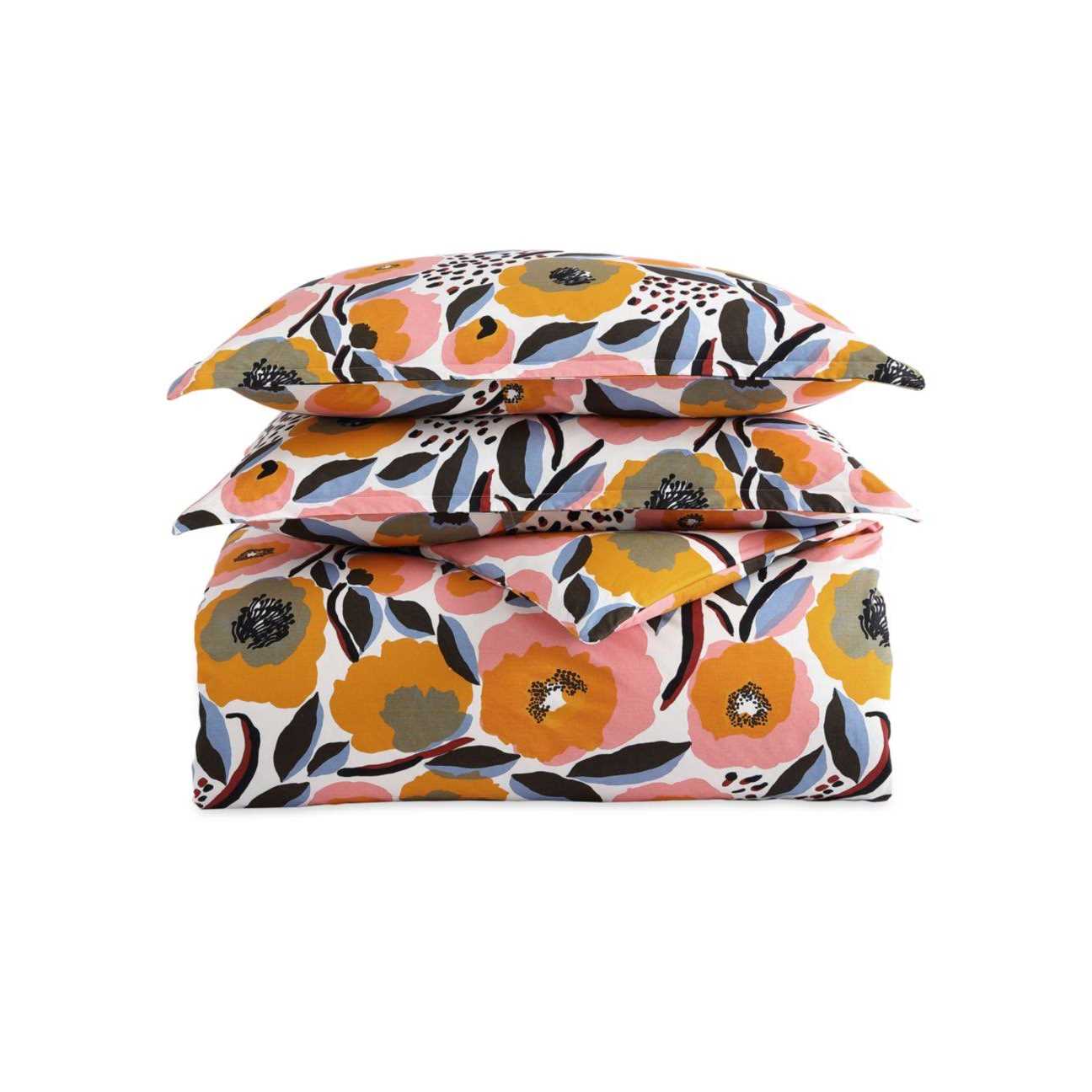 Breathe some new life into your bedroom design with the Rosarium Comforter Set by Marimekko. This set includes a comforter and matching shams. Each piece is woven from premium 200 thread-count cotton with an orange, red, and green rose print pattern. The comforter is stuffed with polyfiber to ensure lasting warmth and comfort. Each piece is conveniently machine-washable. Choose among the available size options to best match your needs.