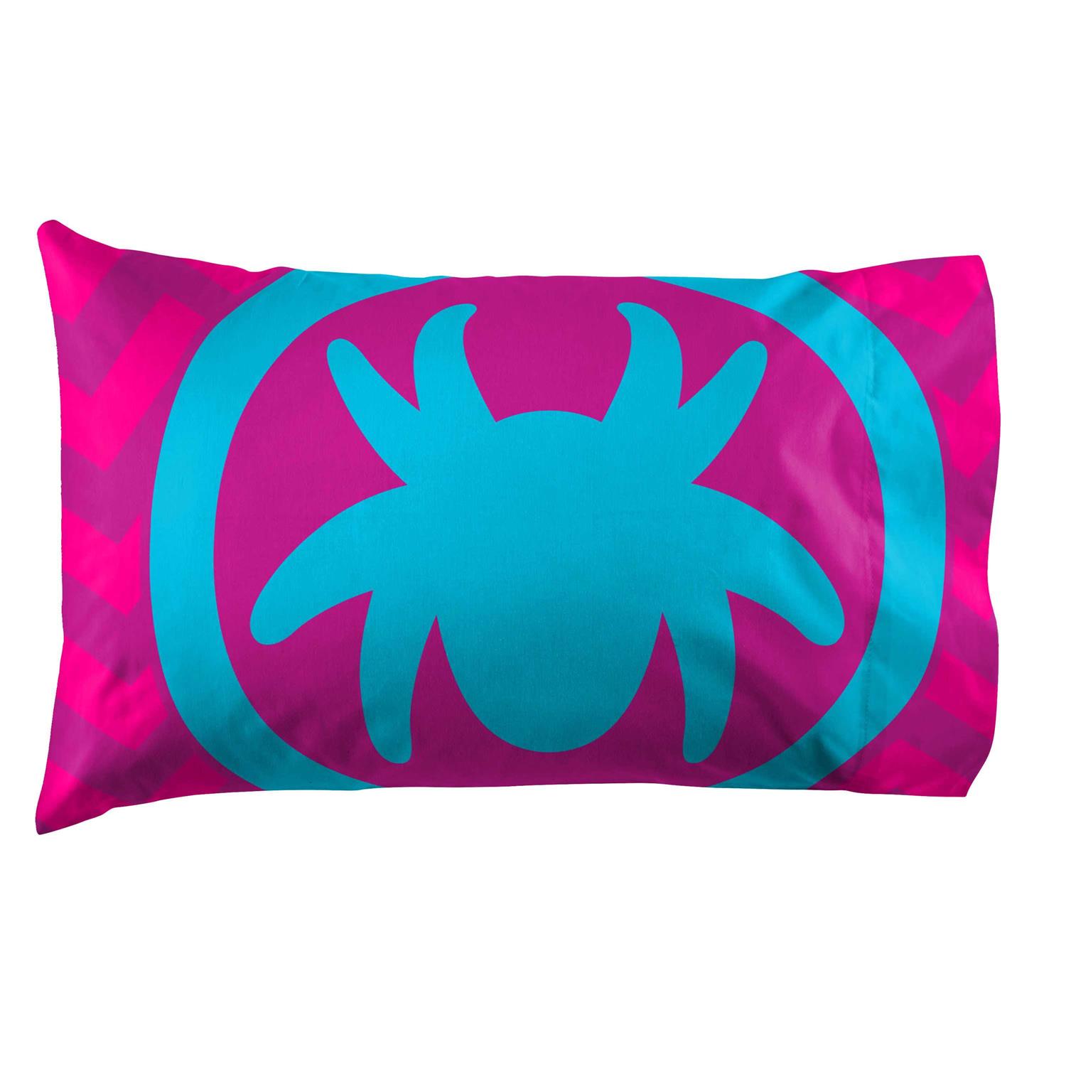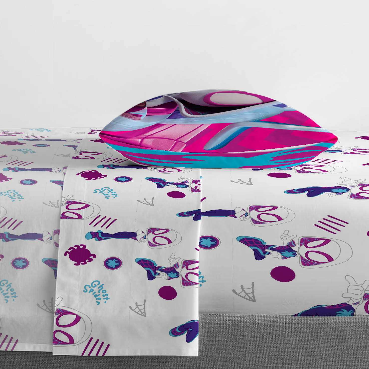 This sheet set will make any kid jump into bed. The colorful and fun design will enhance the existing dcor of any kid’s bedroom. Fitted sheet measures 60 x 80 inches, flat sheet measures 90 x 102 inches, and with two 20 x 30 inch standard pillowcases. Decorative bedding features Gwen Ghost Spidey. This is only the sheet set, comforter sold separately. Jay Franco products are easy to care for. This sheet set can be machine washed cold and tumble dried on low.