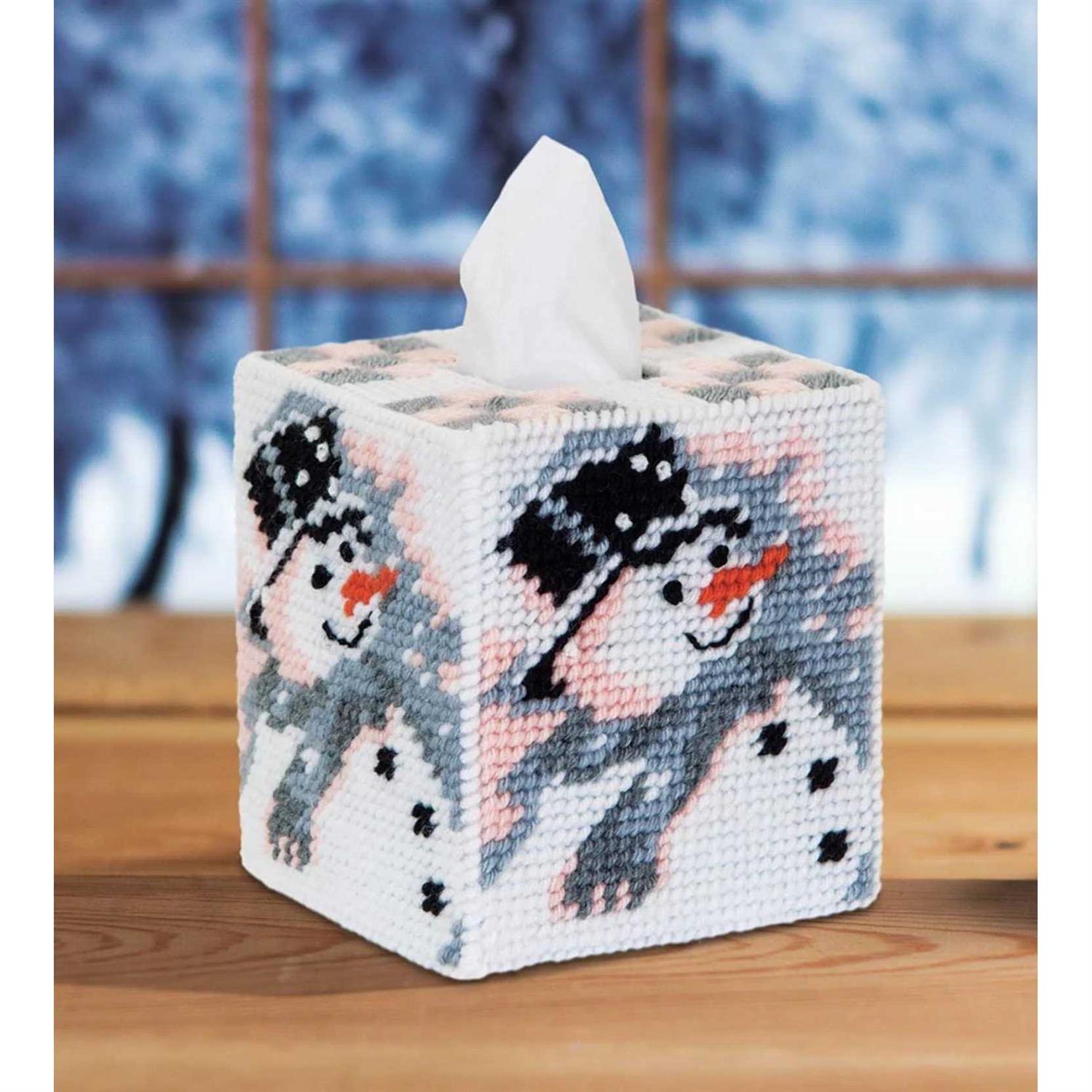 An adorable snowman tissue box to add to your Winter decor. Kit includes 7 mesh plastic canvas, acrylic yarn and pattern. Fits boutique size tissue box.