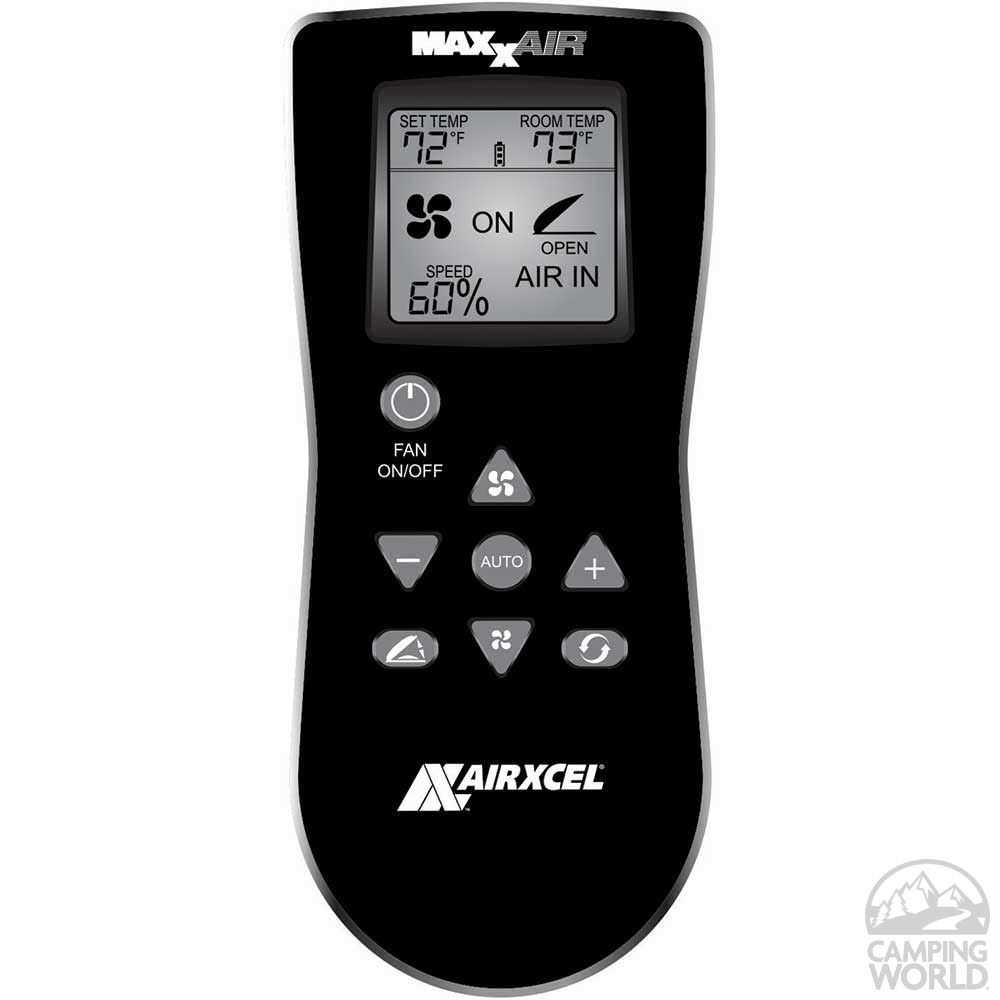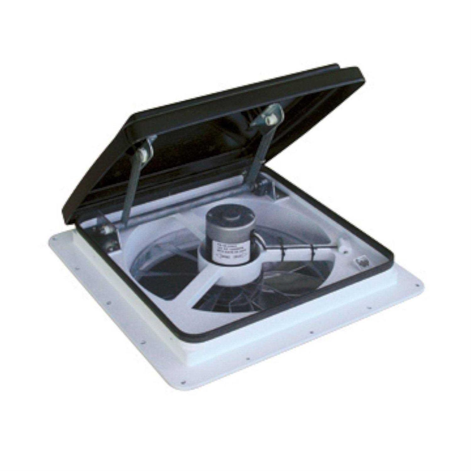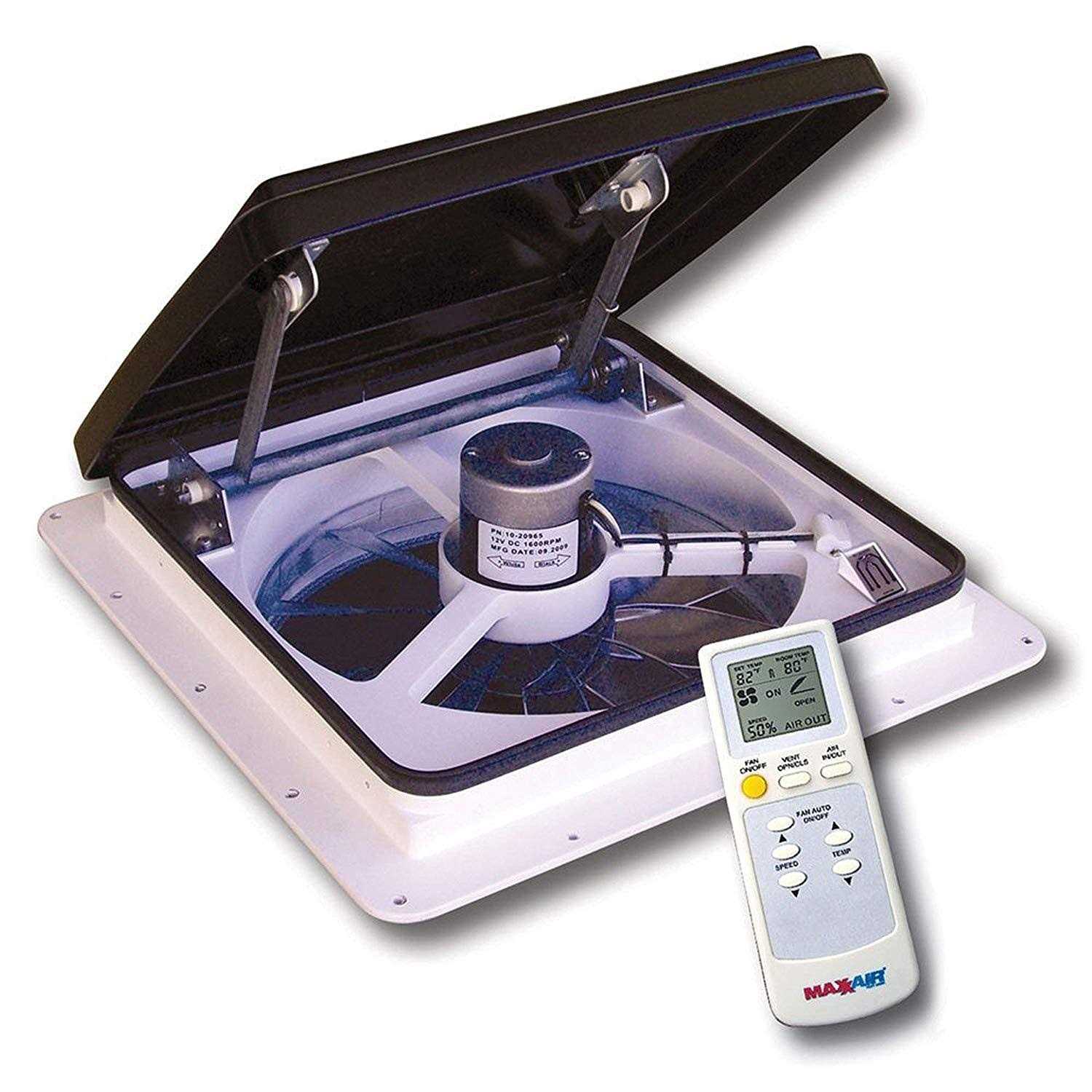 Ventilation by Maxx Air. Details:Control fan speed, thermostat and air intake/exhaust with the included remote control or with flush-mount ceiling keypad. Rain sensor closes lid automatically. Long-life, sealed ball bearing 12-volt fan motor moves over 900 cubic feet of air per minute, quickly and efficiently pulling fresh air in and removing hot, stale air and odors. Run fan with lid closed to circulate air inside your RV like a ceiling fan. Exterior flange has waterproof, molded mounting holes for easy installation of MaxxAir vent covers. Interior insect screen is easy to remove for cleaning. Fits all standard 14” x 14” roof openings. Smoke lid closes securely for low profile appearance. Features: Remote control or ceiling keypad control Electric open Smoke lid Adjustable fan speed Thermostat Rain sensor Intake & exhaust capability Fan runs with lid closed for ceiling fan mode 12”dia. 10-blade fan Long-life, fuse-protected, sealed ball bearing, 12-volt motor Over 900 cu. ft.