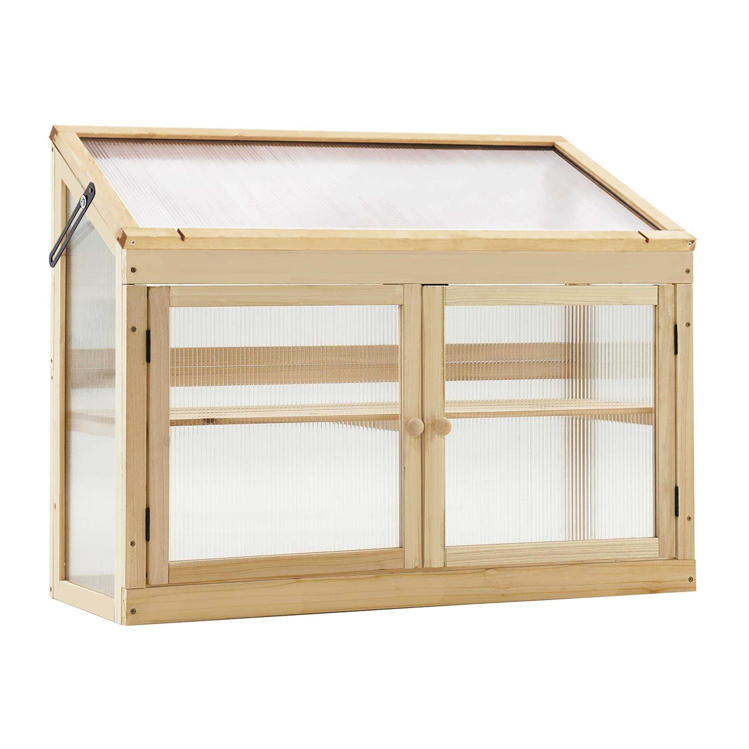 MCombo Features: Structured with heavy-duty wood for extended durability, and the structure follows the scientific principle and is strong enough to hold seed trays, pots, and plant growth light Roof grooves are designed to prevent rainwater from accumulating on the roof and can be used outdoors on rainy days Double shelves provide more space for a variety of plants and flowers to grow up. The foldable top is convenient for plants to absorb the sunlight and keep away from the rain.