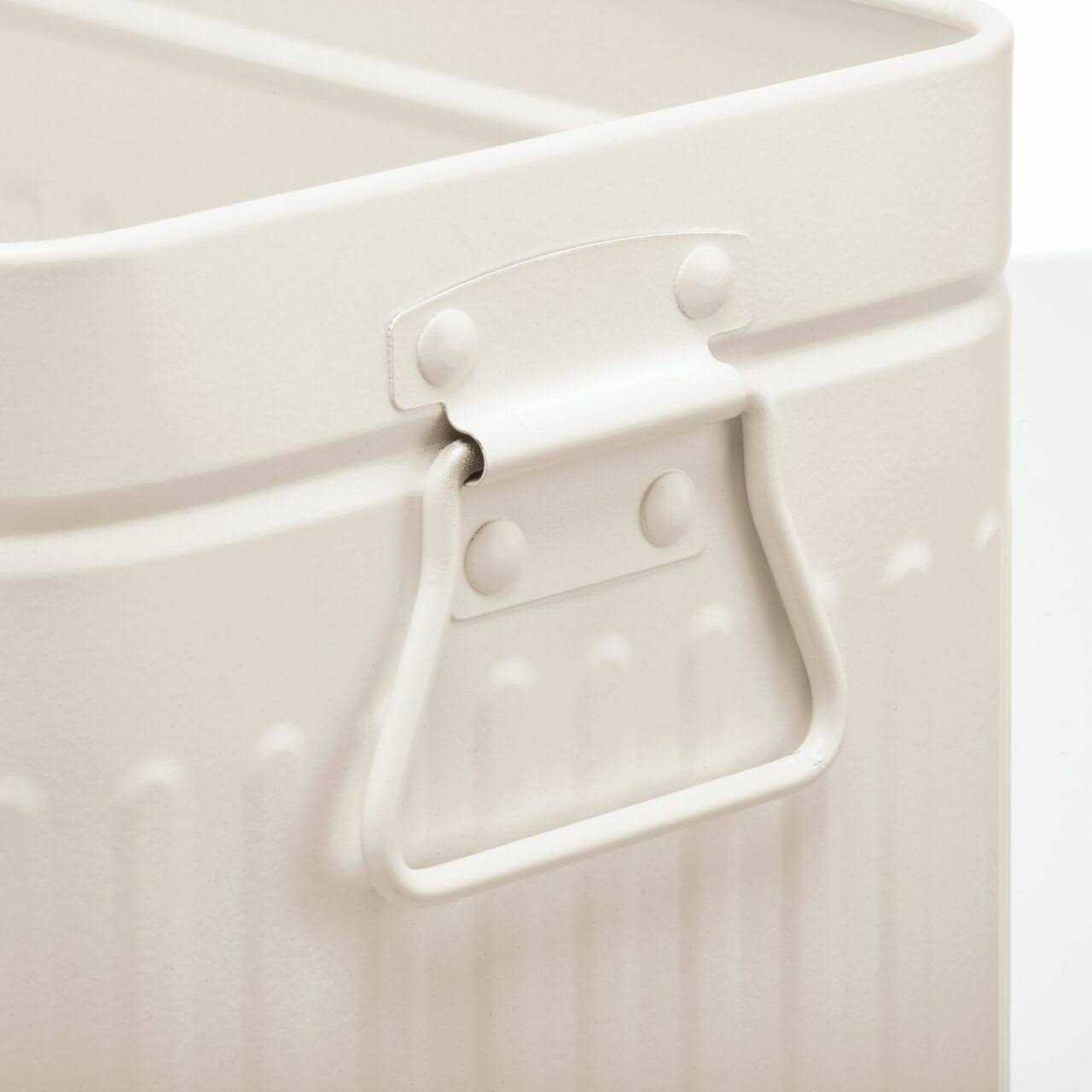 This compact wastebasket looks great and easily fits into narrow openings and small spaces. This decorative can with attached side handles and retro styling will enhance your bathroom decor. Wipe clean with damp cloth. Made of steel with a durable rust-resistant finish. Measures 11″ x 6.5″ x 9.5″ high.