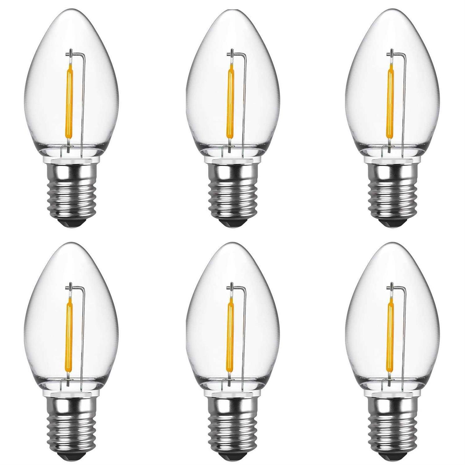 Warm white shatterproof C7 replacement LED bulbs are made of clear plastic, much more shatterproof than the glass incandescent bulbs, high transmittance, fits for E12 socket string lights, indoor and outdoor use. Vintage Style LED Bulbs: C7 filament bulbs provide a warm light glow and creat the retro look of antique filament incandescent bulbs with the benefits of LED, cool to touch. Energy Efficient: 0.6 watt C7 LED edison light bulbs are equivalent to 4W/5W/6W/7W incandescent bulbs, save 80% energy than traditional incandescent lamp. Lower heat dissipation and higher light efficacy. Widely Used: LED vintage C7 light bulbs with candelabra screw base that fits e12 and c7 based sockets, not only the best replacement bulbs for led candle light bulbs, window electric lights, Chandeliers,salt lamps, nightlights, but also good choice outdoor indoor C7 string lights.