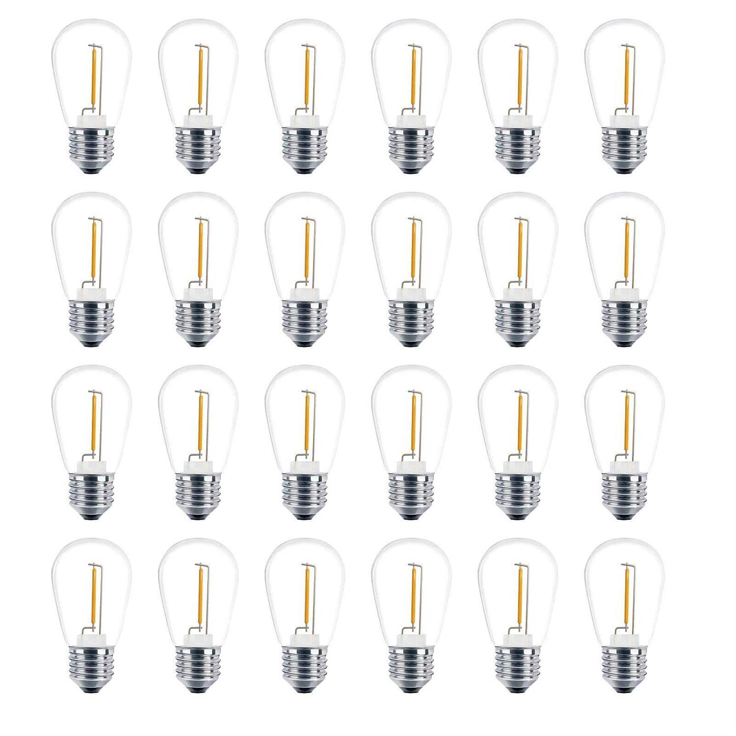 ️Warm Tips: Do not work with solar string lights. ️ Warm Tips: Please screw bulbs in tightly. Plug in set and if any bulbs not light, tighten it further. Shatterproof and waterproof: Meconard S14 led bulbs are made of plastic materials, which is durable and drop resistant,not easy to fragile. Perfect replacement bulbs for glass incandescent bulbs of indoor and outdoor string light. Energy Saving and good heat dissipation: 1 watt LED filament light bulbs are equal to 11 watts incandescent bulb lamps,90% energy saving than the edison incandescent strand light bulbs, keep cool to the touch, never overheats. Widely use and Easy to install: 2200K warm white LED provide a warm light glow and build the retro look of antique filament incandescent bulbs with the benefits of LED, which is widely use in indoor and outdoor string light and other lighting fixture, you just need screw it in to the E26 regular base for string lights and other E26 medium Base lamp,then you can enjoy the vintage atmosphere and comfortable warm white glow.