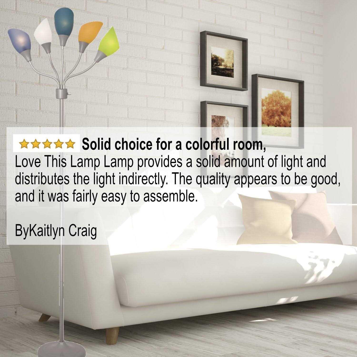The floor lamp made from durable metal with a silver-painted finish features a combination of light blue, lime green, orange, white, and teal shades that offer both color and contemporary style. Perfect for use as a living room floor lamp, kids room floor lamp, or dorm room floor lamp: The multicolored shades give this floor lamp a unique look and make it perfect for use in any kids room, living space, or dorm room. Adjustable gooseneck arms offer versatile lighting options This floor lamp features adjustable arms that allow you to point the shades in different directions. Designed for use with five 25 watt candelabra base bulbs or the LED equivalent recommended, this modern floor lamp adds a playful pop of color to any room. With five different color shades, this multicolored floor lamp standing lamp will transform any living room, kids room, or dorm room into a lively living area. The heads of the lamp are fully adjustable with flexible goosenecks, and the 5-foot black power cord makes it easy to reach your power outlet. It also features a rotary switch, which gives you the freedom of alternating the shades you want to illuminate. With a simple click of a switch, you can turn on two color shades, click again to light the remaining three color shades, or have all colors lit all at once! Measuring almost 70 inches in height, this standing light makes a great torchiere floor lamp for a kids room.
