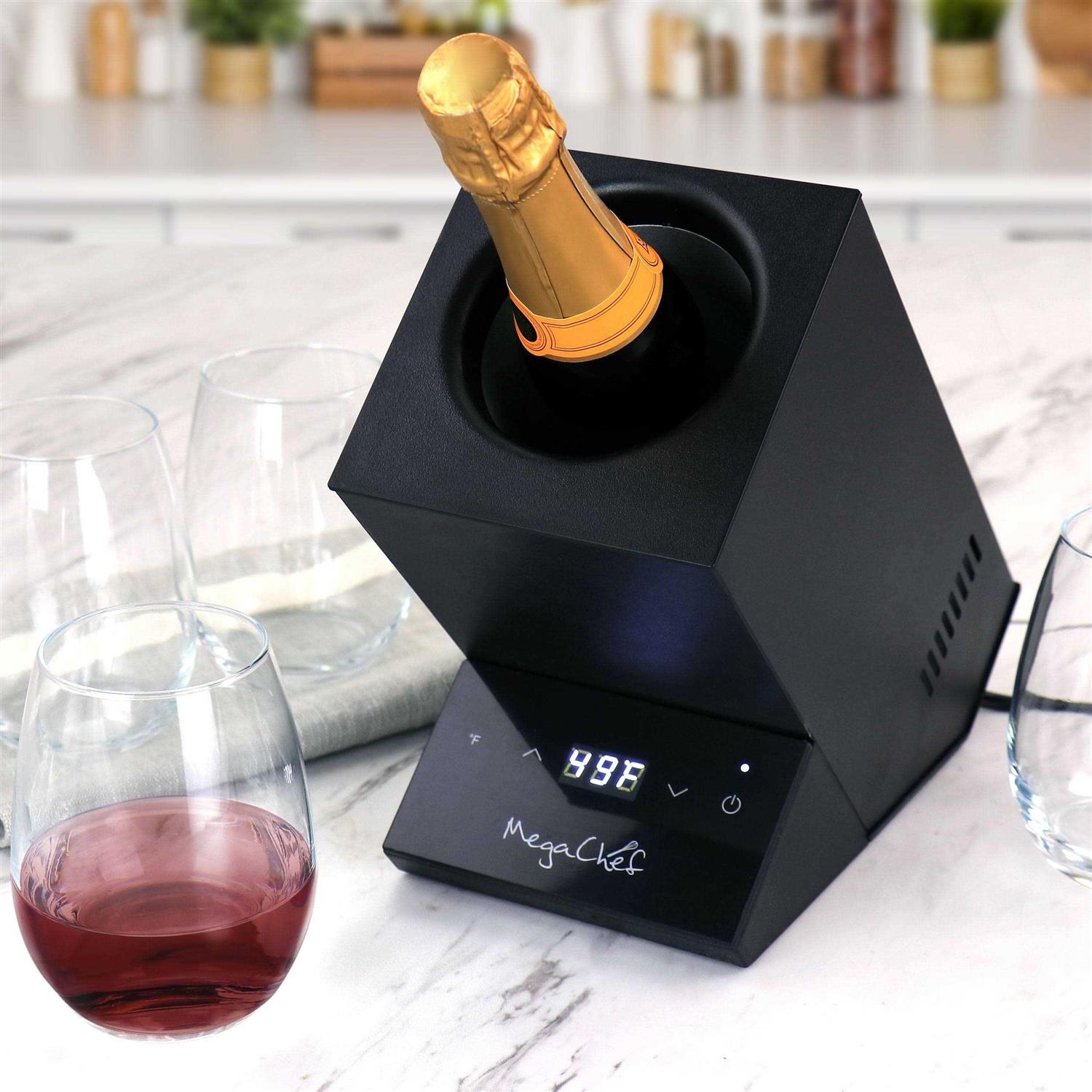 Looking forward to a bottle of wine has never sounded more exciting with the MegaChef Bottle Cooler. From your favorite red s to your delicious whites and celebratory champagne, the rapid cooling system will have your bottles ready all at a touch of a button. Compact and lightweight with ultra quiet sound, this innovative machine is perfect for any and every setting. Chill to perfection without the use of ice. Ideal for kitchen counters, tabletops and home bars.