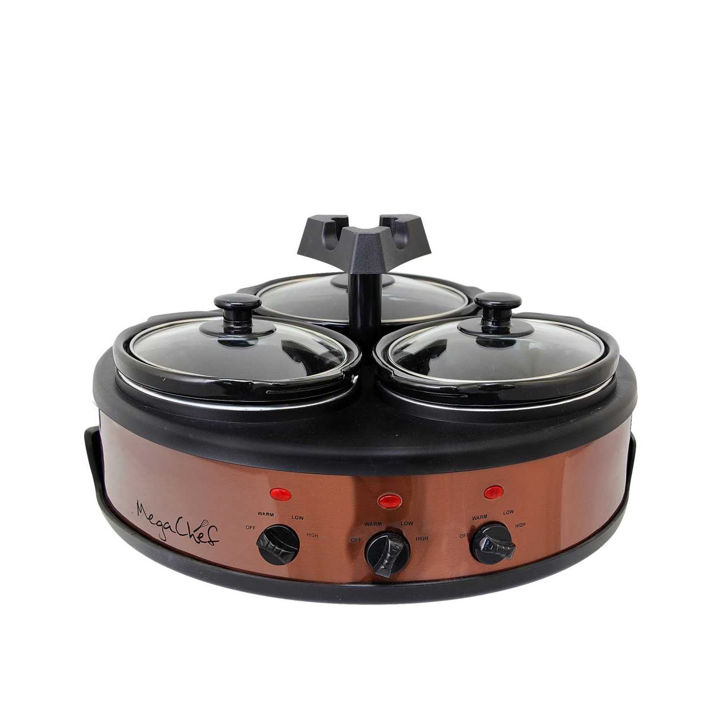 With the New MegaChef Triple 2 Quart Slow Cooker and Buffet Server in Brushed Copper and Black Finish with 3 Ceramic Cooking Pots and Removable Lid Rests will be your helping hand whenever you need to prepare multiple meals simultaneously without the hustle and bustle of a restaurant kitchen! With this incredible kitchen tool, you will be able to not only cook 3 individual meals at the same time without having to monitor the stove, but you will also be able to keep those meals hot and serve them to your family and friends or guests and coworkers without breaking a sweat. This stunning slow cooker and buffer server features 3 Ceramic 2 Quart Cooking Pots with their own settings allowing you to control the heat level for each meal you cook. With the included detachable lid rests, your guests can easily serve themselves hassle free. Once you try serving meals with such ease it may be difficult to go without this unit again at any gathering!