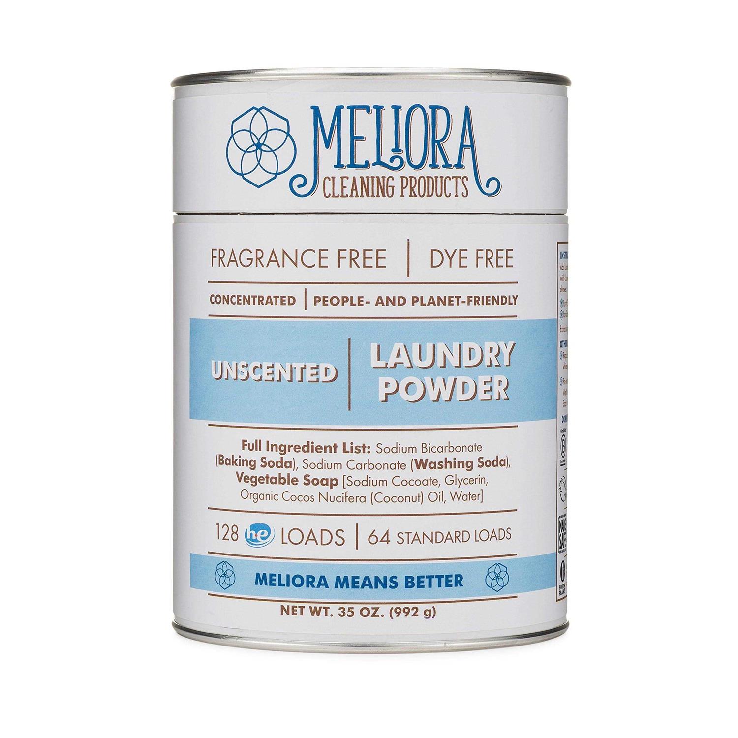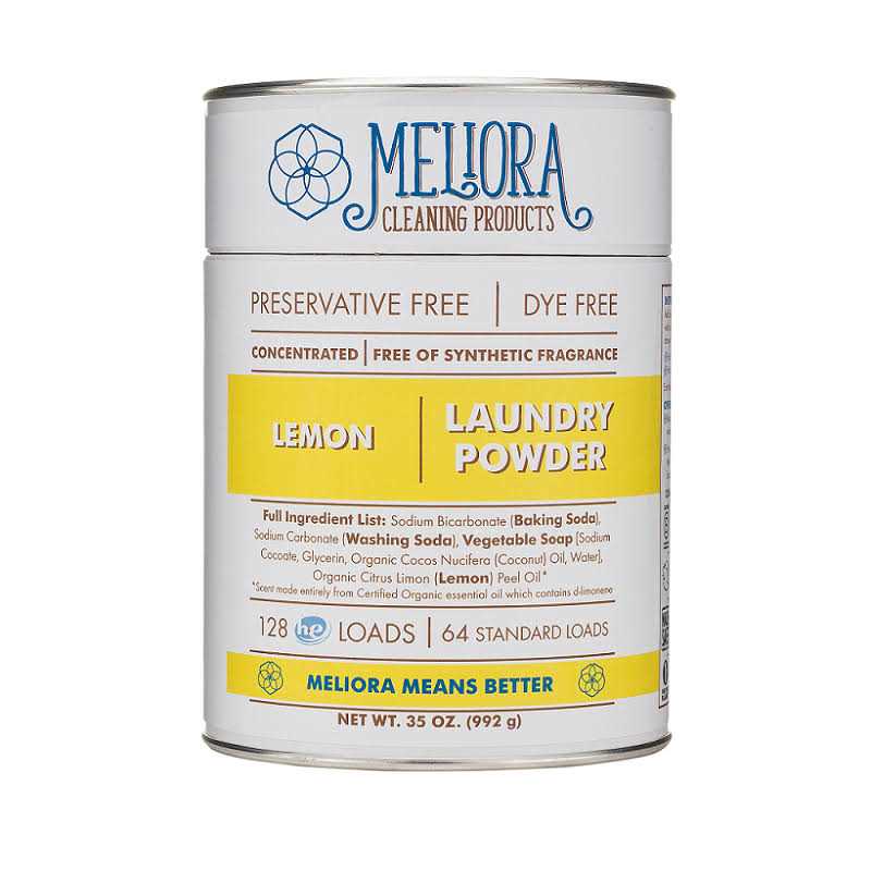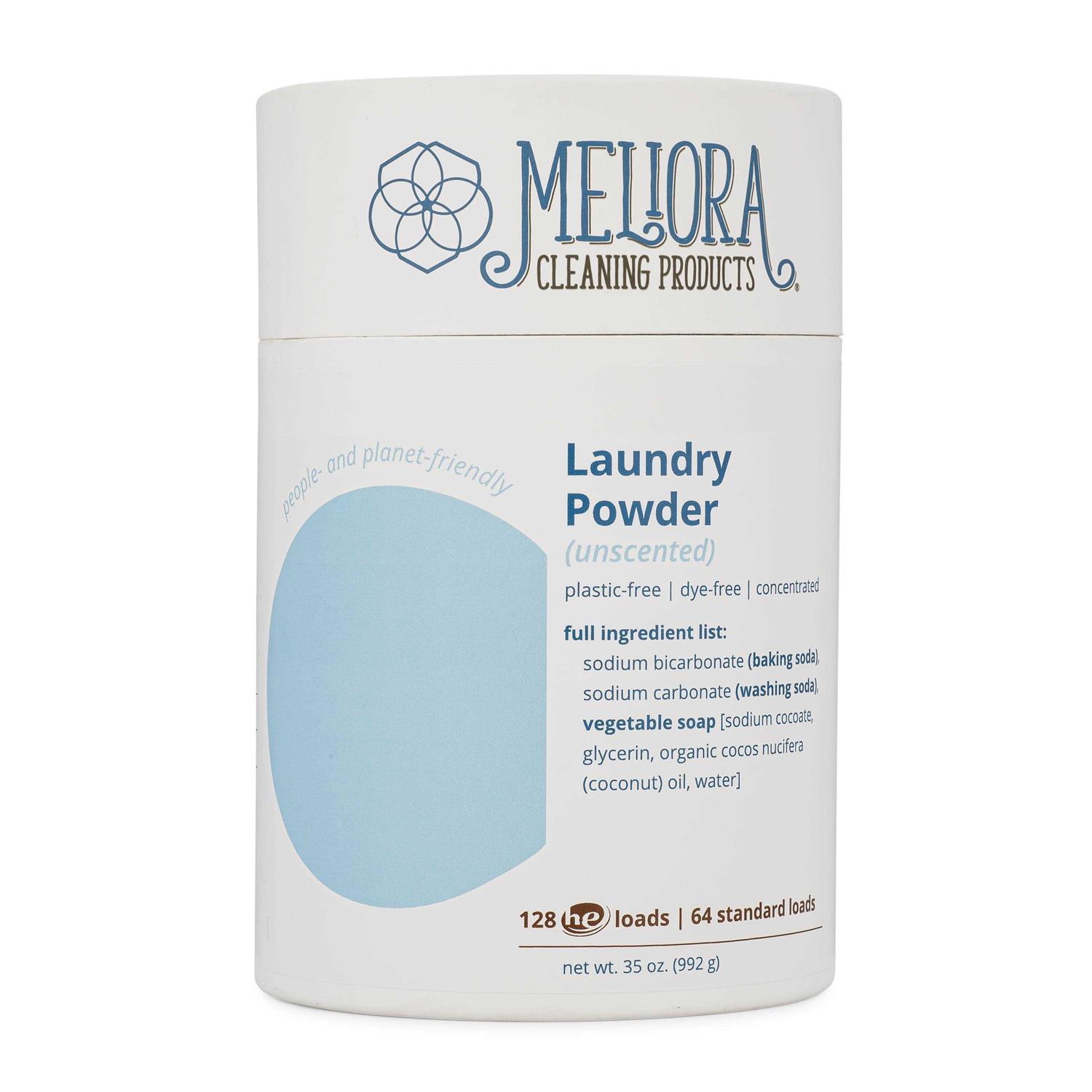 Meliora Laundry Powder is a powerful non toxic eco friendly laundry detergent. Available in a plastic free container or in bulk refill bags. All Meliora eco laundry detergent powders clean clothes without harsh chemicals, synthetic fragrances, dyes, preservatives, and brighteners. Use for 128 HE (64 Standard) Loads.