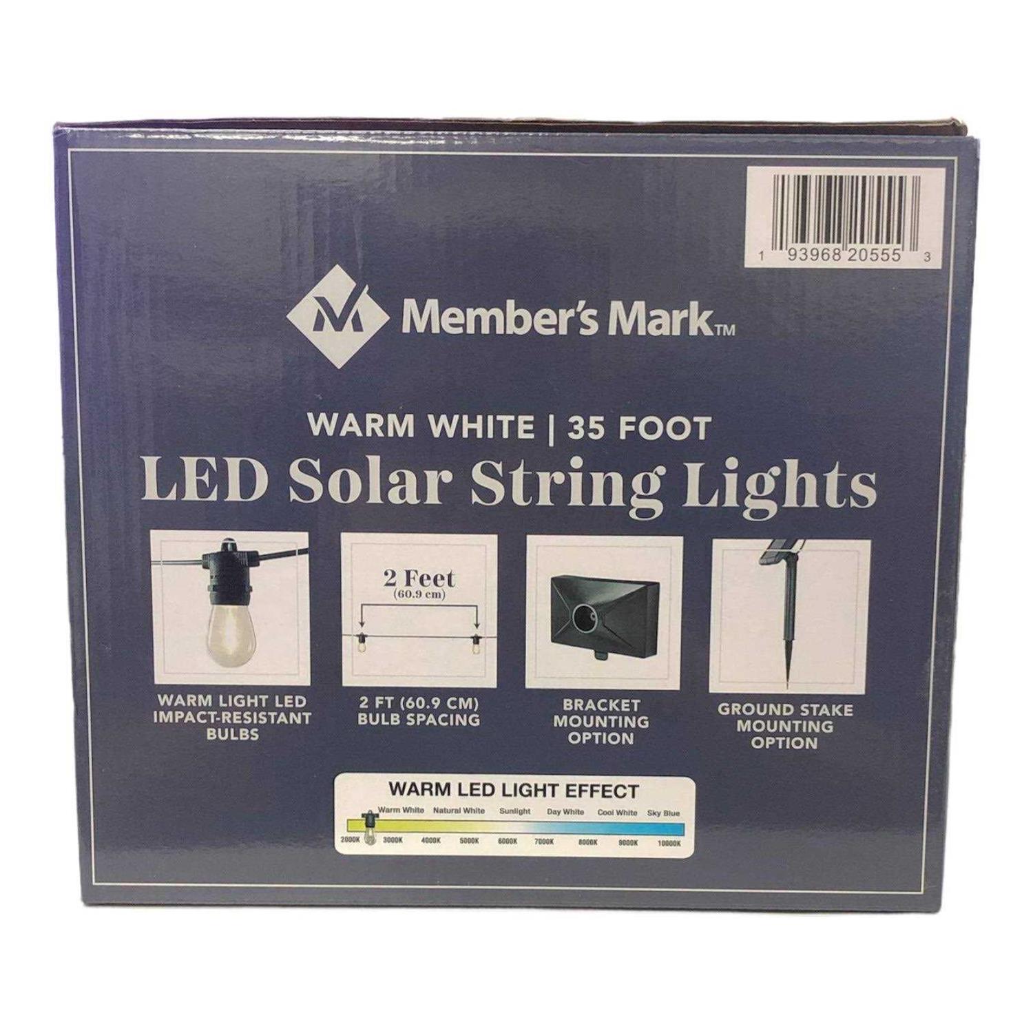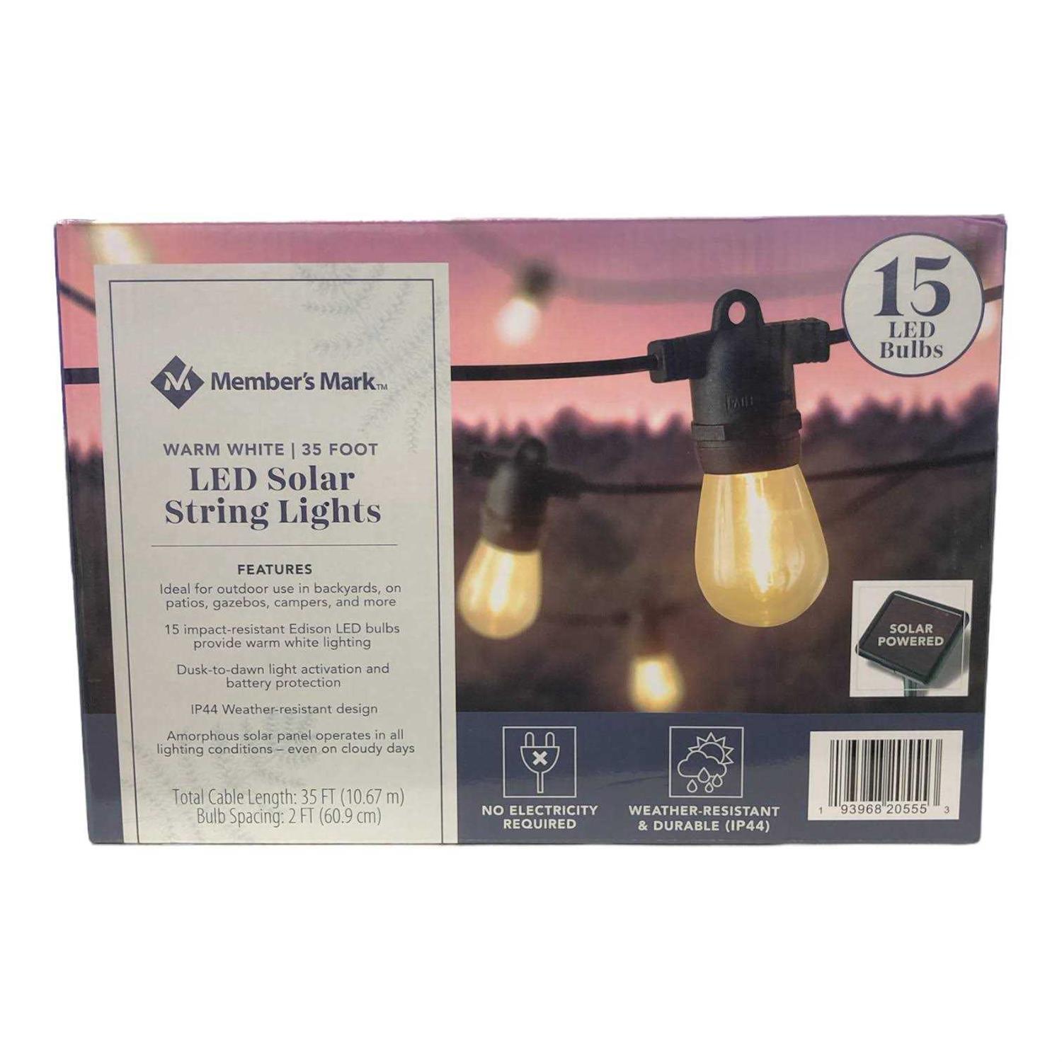 Powered by the sun, its easy to add a soft, warm glow to your backyard, patio, gazebo, camper, and more with Members Mark 35 LED Solar String Lights. Equipped with 15 vintage style bulbs, 35-feet of cable, automatic light activation, battery protection, and a long-lasting amorphous solar panel, these string lights add a decorative classic feel to any outdoor and indoor location–without the need of a power outlet. Ideal for decorative and outdoor use, these 15 LED bulbs provide warm white lighting, even on cloudy days.