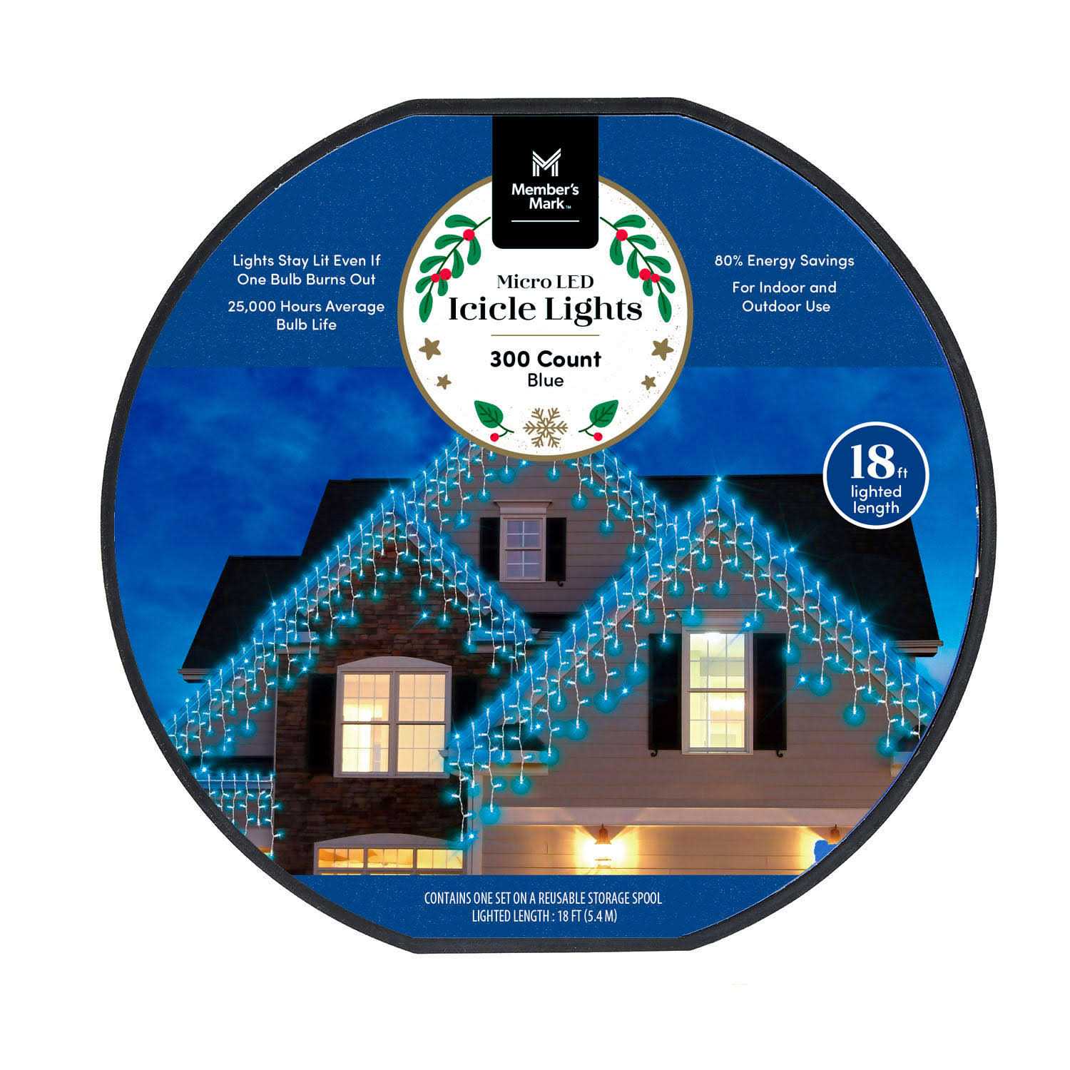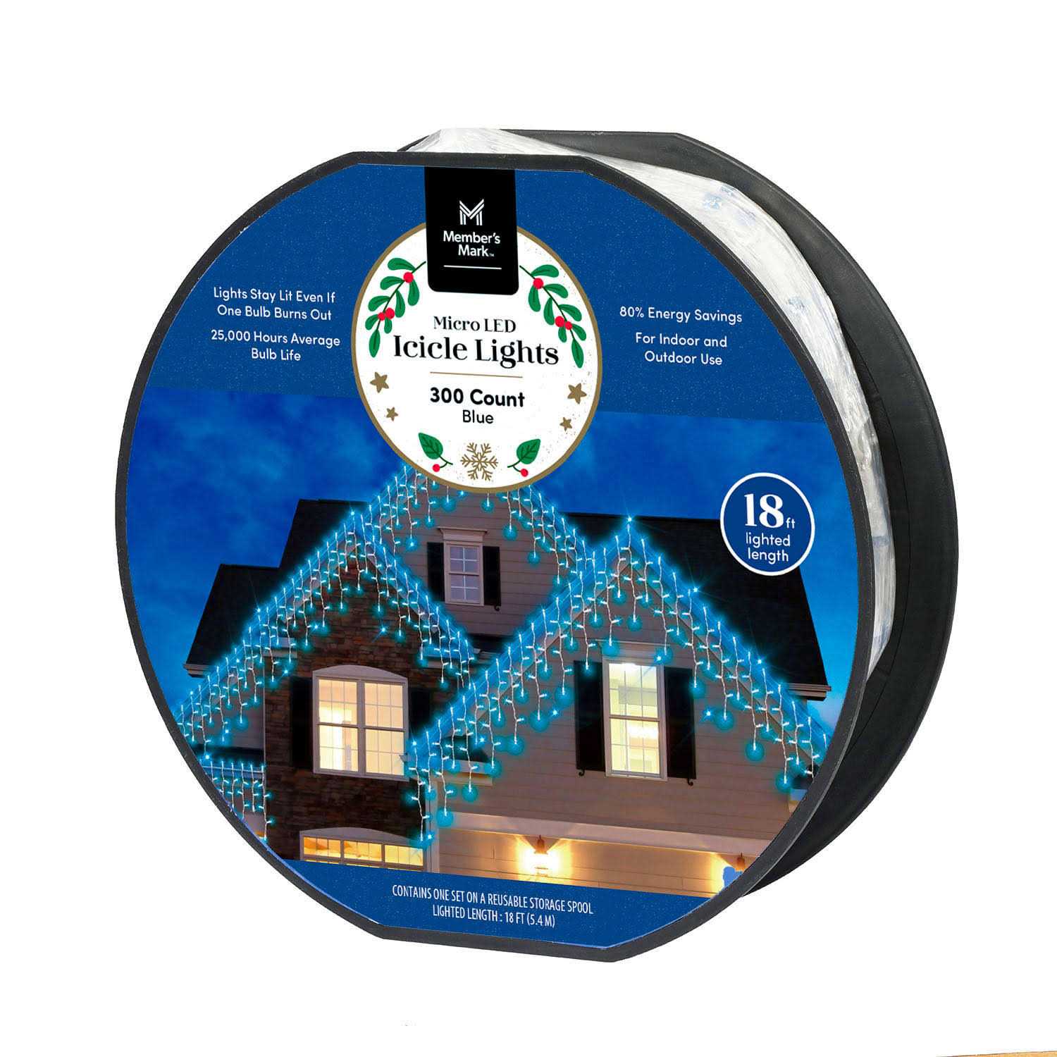 Member’s Mark 18-foot 300 Count Super Bright Micro LED Icicle Lights are the perfect accent for your home during the holidays. These super bright micro LED lights are 20% brighter than standard led bulbs to ensure that your house has a bright and festive glow.Classic and beautiful, icicle lights are a popular choice for the holidays as they can be hung across angles or straight lines. Roof awnings, overhangs, peaks, and windows are great locations for hanging icicle lights because the drops lay naturally to create a professional and quality display with ease.These lights have a lighted length of 18 feet and can be connected to up to 15 strands. The lights can be used both indoors and outdoors. LED lights have a long bulb life-25,000 hour on average and feature energy savings of 80%. With the long bulb life there are fewer resources used over time. These lights will stay lit even if one bulb burns out.An additional benefit of these lights is that they are environmentally friendly as both the light set and packaging are reusable. The lights are packaged on a reusable spool that is perfect for storage when the lights are not in use. Exclusively available at Sam’s Club, the Member’s Mark 300 Icicle Lights are on a white wire and available in three colors.