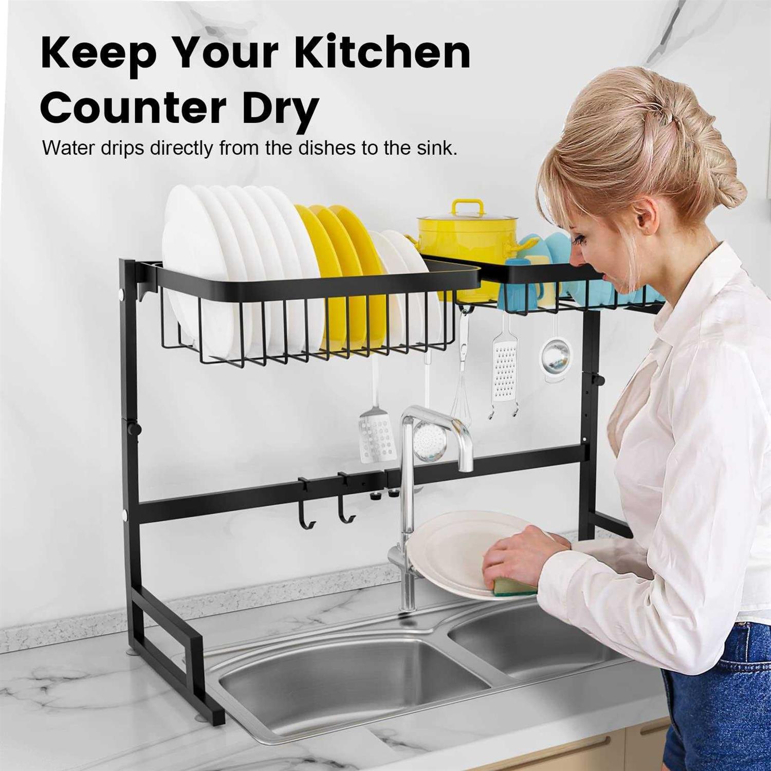Premium 201 Stainless Steel Dish Drainer The adjustable dish rack made of food grade 201 stainless steel with three layer nano coating and covered with a black baking finish, sturdy and more effective than ordinary metal to protect against rust, corrosion, moisture and scratches. An ideal gift for cooking and food and an ideal Christmas gift for friends and family. Large Capacity & Space Saving The large kitchen drainer keeps your kitchen clean and tidy, fits more on the kitchen counter, meets the basic needs of the family. Dimensions (L x W x H): 85 x 33 x 50 cm. Also think of the cabinet above the sink, the height of the rack is 53 cm, so make sure there is another 10 or 20 inches distance More Stable and Durable – The dish rack on the sink is constructed of thick and strong square tube, 90° elongated folded legs can better balance the heavy weight and more stable than other straight legs, won’t lean forward, so there will be no shaking and tremors that will make the plates fall down. It can hold up to 120 pounds. Non slip rubber feet will keep the rack and rack more stable. MULTIFUNCTIONAL DRAINER The dish rack includes: 1 x bowl drainer rack, 1 x dish drainer rack, 1 x knife rack, 1 x cutting board holder, 1 x detergent rack, 1 x cutlery rack, 8 x hooks and 1 x paper towel holder. All parts are adjustable and removable so you can customize them to your preference, and they are washable and dishwasher safe so you can clean and disinfect them.