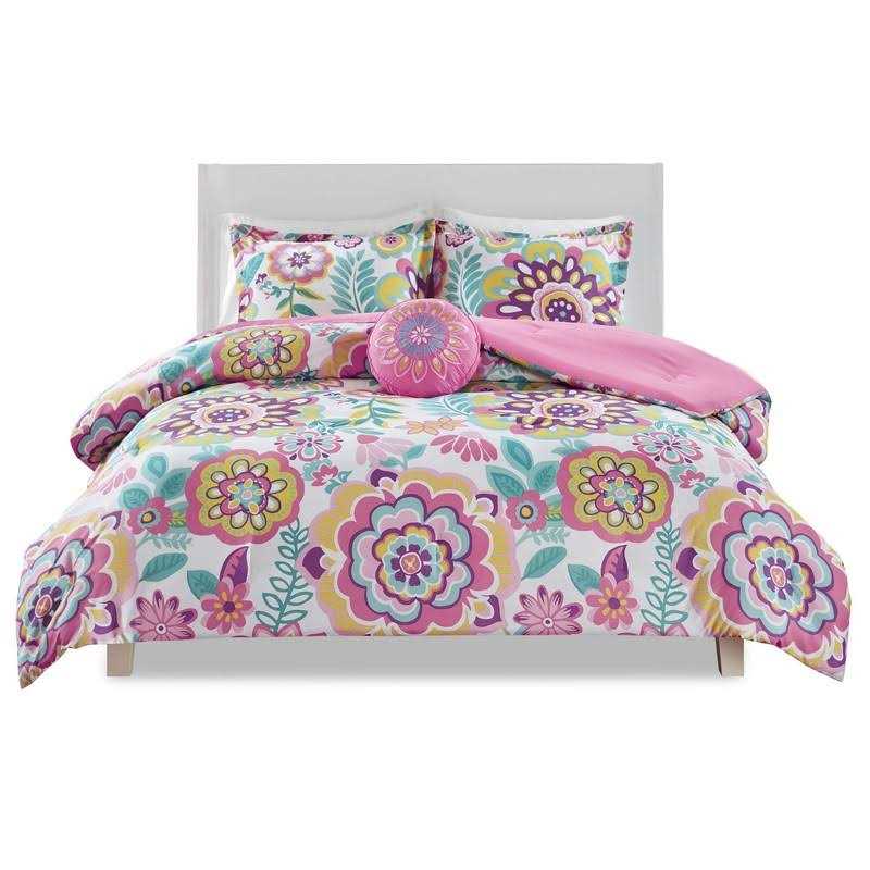 Brighten your bedroom with the fun and colorful style of the Mi Zone Camille Floral Comforter Set. The bright comforter and shams (1 in Twin/TwinXL) features a vibrant medallion flower print with a solid pink reverse, creating an adorable look. A round floral decorative pillow with embroidery complements the comforter set and adds the finishing touch. This bedding set uses an antimicrobial treatment that provides built-in freshness protection, reducing the growth of odor causing bacteria to keep fabric lasting longer.