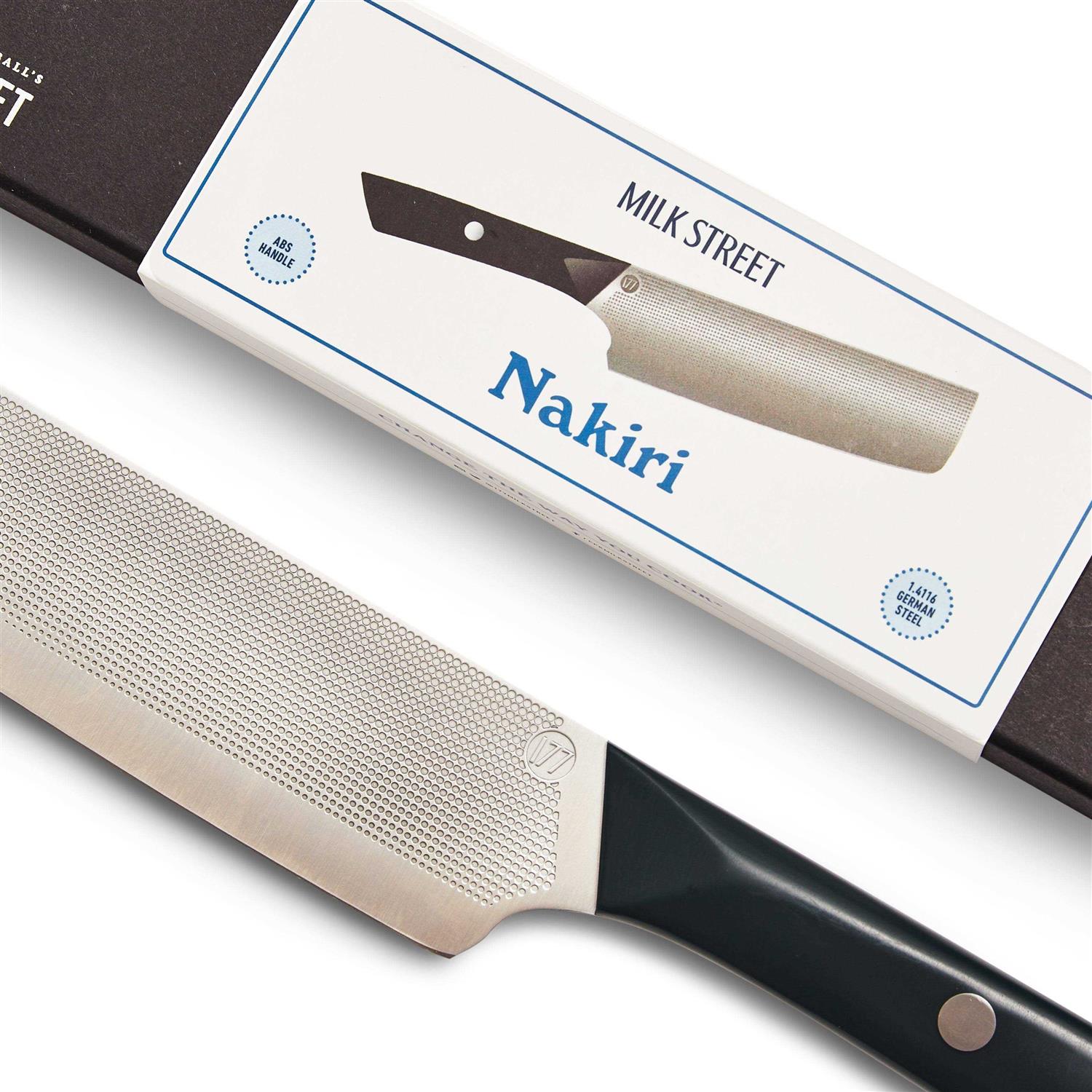 It is vastly better than the all-purpose European chef’s knife, which is clunky, heavy and too thick to precisely slice and dice onions, cut carrots into perfect coins or reduce chard into feathery ribbons. The solution is the Milk Street Nakiri. It’s light, thin and sharp, with a design that resembles a mini cleaver—2 inches deep with a squared-off tip. A very thin blade, just 1.6 millimeters at the top, tapers down even thinner toward the end so it slices through even tough ingredients effortlessly without bending. The broad blade shields your fingers when you chop and works as a bench scraper to transfer chopped veggies to the simmering pot. The blade is embossed with a nonstick file pattern that replicates the kourochi (blacksmith) or tshuchime (pear skin) finish to traditional nakiris, so sliced ingredients fall right off. A gentle curve accommodates fingers when choking up tight for control, and the handle has been designed to provide a nonslip grip. Specifications Net Weight: 6 ouncesDimensions: 6.75 inch blade Materials: -Blade: 1.4116 German Steel -Handle: Black Polymer Care and Use Care: The knife must be washed by hand and dried after each use immediately to ensure no staining occurs. To maintain the blades edge, sharpen the Nakiri at a 17 degree angle. [/accordions_break] Milk Street Nakiri Kitchen Knife | Milk Street Store