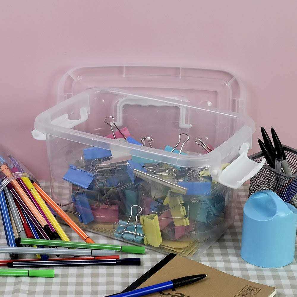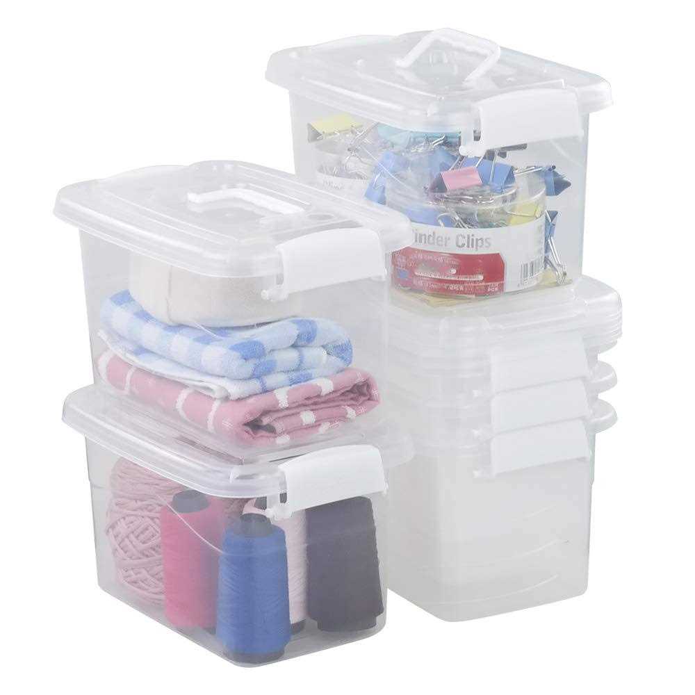 One set includes 6 boxes with 6 lids, can be used in variety place. Outside size of one box is 11.1” x 7.52” x 6.42”, and made of plastic for sturdy use. Simple design, 2 latch clips and handle design, good for storage.