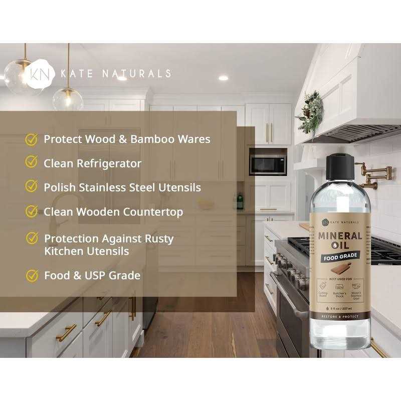 Brand: Kate Naturals Features: FOOD SAFE MINERAL OIL FOR CUTTING BOARD: Our Cutting Board White Mineral Oil is a smooth, lightweight oil that is ideal as a conditioner and protectant for treating wooden and bamboo cooking products, including cutting boards & butcher blocks, while also cleaning & maintaining stainless steel. CUTTING BOARD OIL: This smooth USP & Food Grade Mineral Oil is ideal for protecting cooking products made of wood from cracking or splitting. It can also be used to protect stainless steel blades & appliances from rust. Mineral oil can be used for soapstone countertop and for rock polishing. BUTCHER BLOCK OIL: Mineral oil can be used a butcher block conditioner and can be used as a wood oil. Our mineral oil is unscented, colorless, odorless, tasteless, and gluten free. In addition to protecting cutting boards, mineral oil food grade can be used for ears and skin. It can be used as a laxative and constipation. Package Dimensions: 48x187x222 UPC: 810002448270
