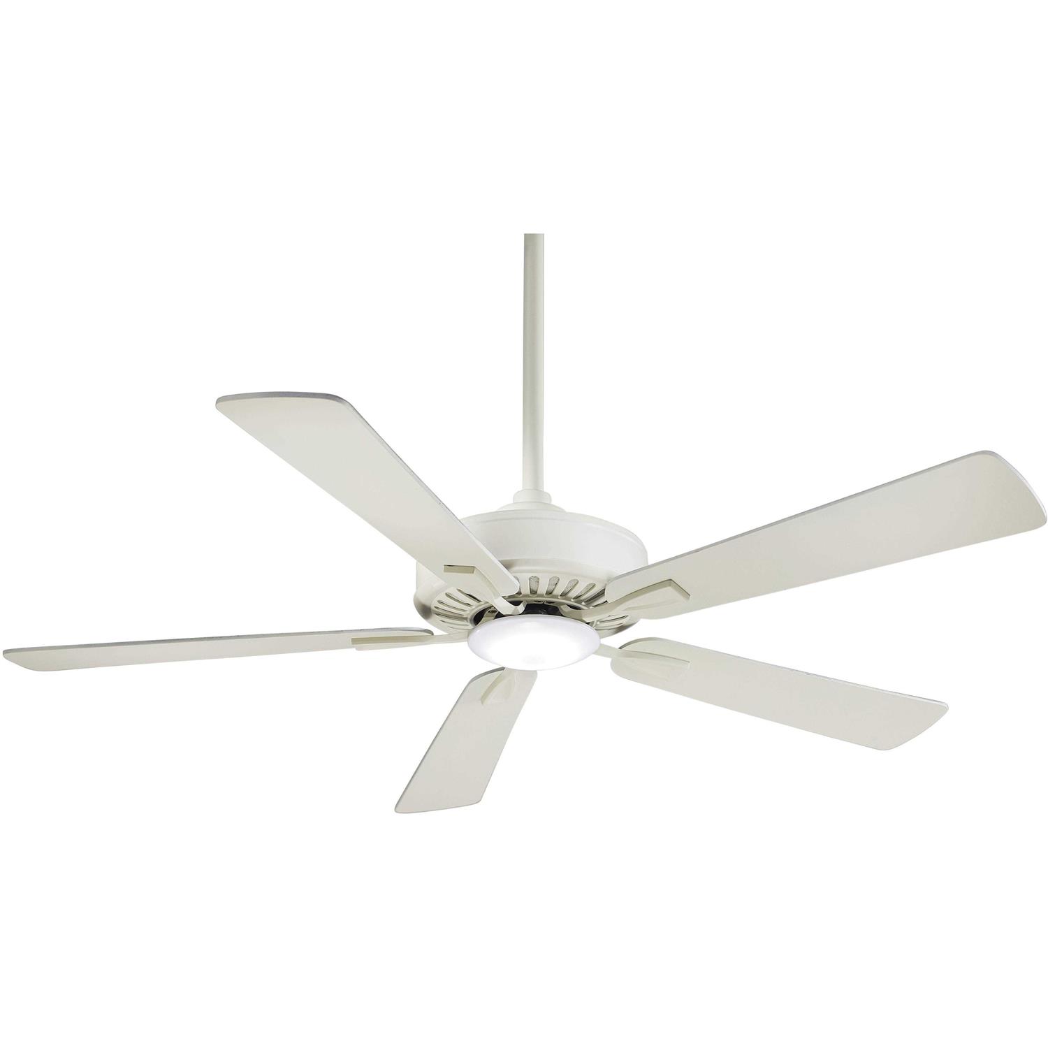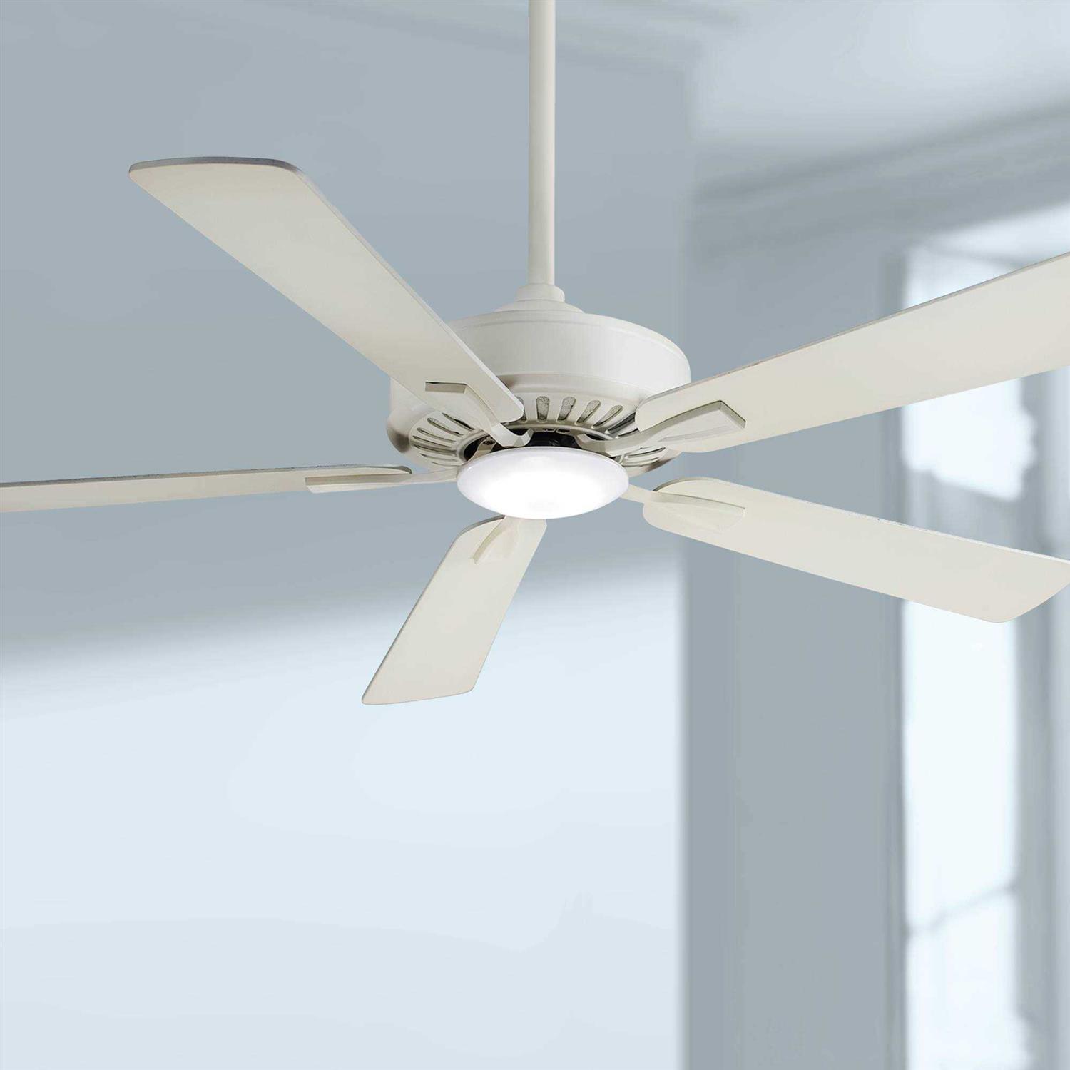 This Contractor LED style ceiling fan is a simple design paired with smart technology. The fan measures 13 1/4 inches tall and features a 52 inch blade span. Features five blades with a blade pitch of 12 degrees and a 3-speed pull chain. Includes a 17 watt dimmable LED bulb.