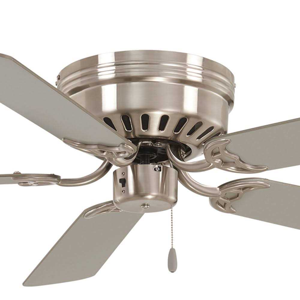 Mesa 52″ 5 blade fan features a white finish and white blades. Blade sweep is 52″ with 12 degree pitch. Available in 52″ and 42″ versions. Flush mount 8.75″ with an overall ceiling drop. Includes 3-speed pull chain and quick connect detachable switch cup. One piece stamped body. Universal light kit adaptable.