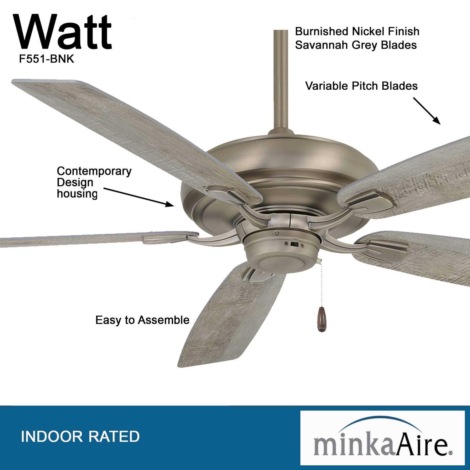 The Watt 52in Ceiling Fan features five blades at a 13 degree pitch complemented by a 125×30 mm DC motor allowing for optimal airflow. With three speeds operated by a Pull Chain this fan is the perfect addition to any room. Available With or Without Light with a Coal Finish and Coal blades, Polished Nickel finish with Dark Maple blades, Burnished Nickel with Savannah Grey Blades, Oil Rubbed Bronze finish with Rustic Wood Blades, Brushed Nickel finish with Silver blades, or a White finish with White blades. ETL listed. DC Motor.