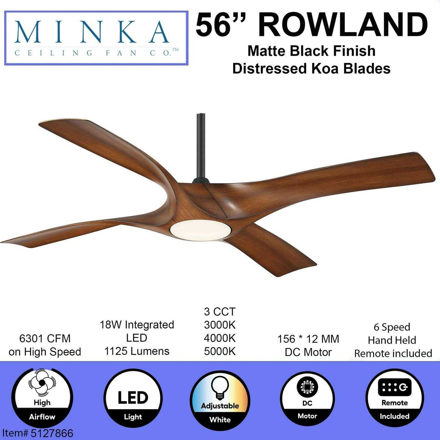 Sleek, simple and amazing. The Rowland Collection by Minka Ceiling Fan Co, the new CCT LED Ceiling Fan in Matte Black Finish comes ready to serve all of your indoor and outdoor cooling needs. With a swift 56 inch blade sweep, this Ceiling Fan quietly circulates four Distressed Koa finish blades with seamless fluidity. The fan is equipped with CCT LED technology for additional luminance with energy and cost-saving value. The Rowland Collection by Minka Ceiling Fan, takes ceiling fans to the next level of cutting-edge technology Minka Ceiling Fan Co.