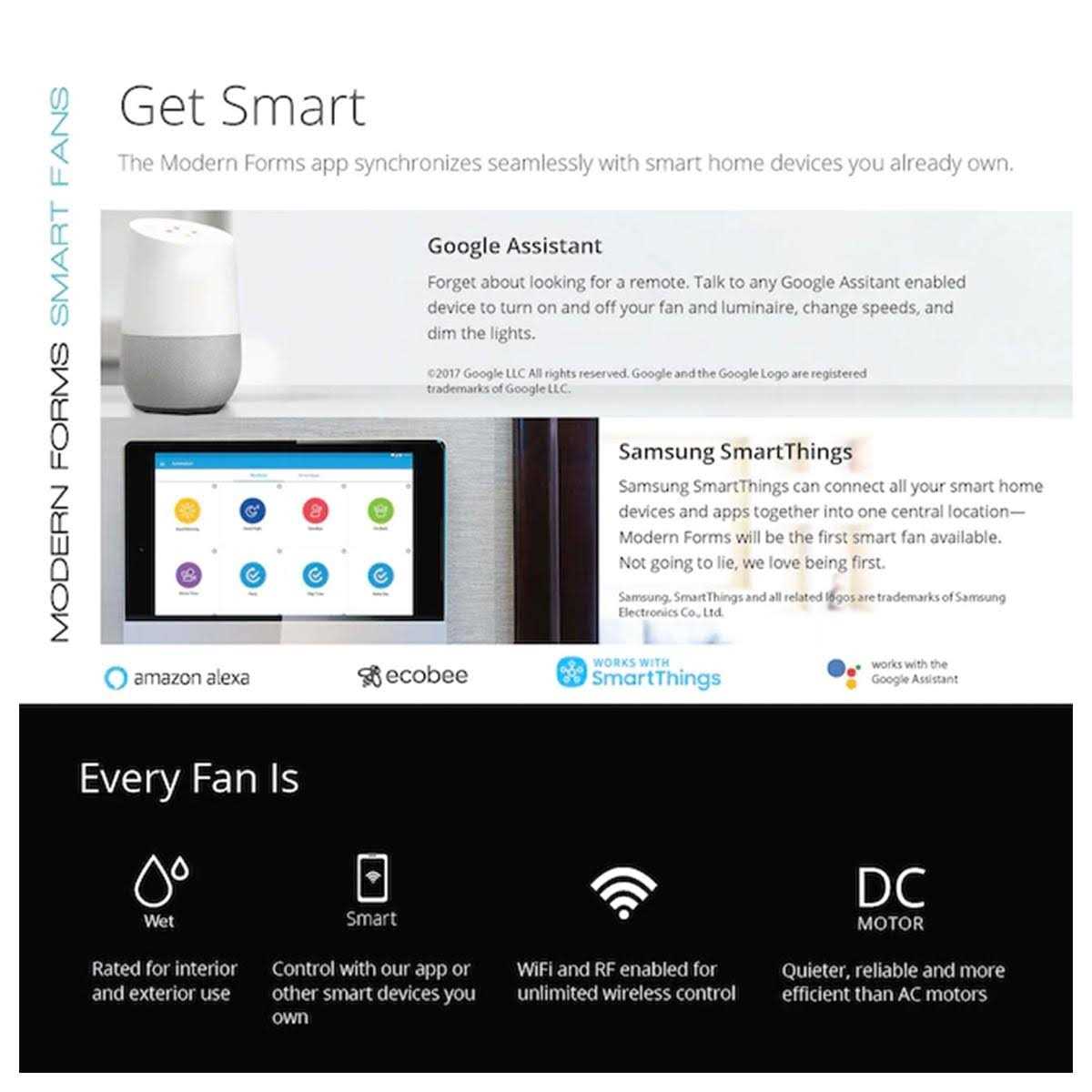 The Renegade Ceiling Fan with Light ranges in style from rustic to industrial modern with its wide selection of finishes. It suits many decor settings, and its wet-rated weather-resistant aluminum housing ensures top performance both indoors and outdoors. Equipped with an LED light and quiet DC motor, this fan illuminates and refreshes your space while ensuring energy efficiency. A Bluetooth remote control is included and enables 6 speeds, forward and reverse, motor on/off, and light on/off with dimming. A light cap for no-light use is also included. Optional controls and downrods are sold separately. In addition to remote control use, the Renegade smart fan can be controlled by connecting with smart home tech including Google Assistant, Amazon Alexa/Echo, Samsung Smart Things, Ecobee, Control 4, and Josh.ai. The free Modern Forms app is another control option, chock full of functions such as fan speed and light brightness adjustment, Adaptive Learning, scheduling, and fan grouping. This fan fits perfectly into your modern lifestyle.