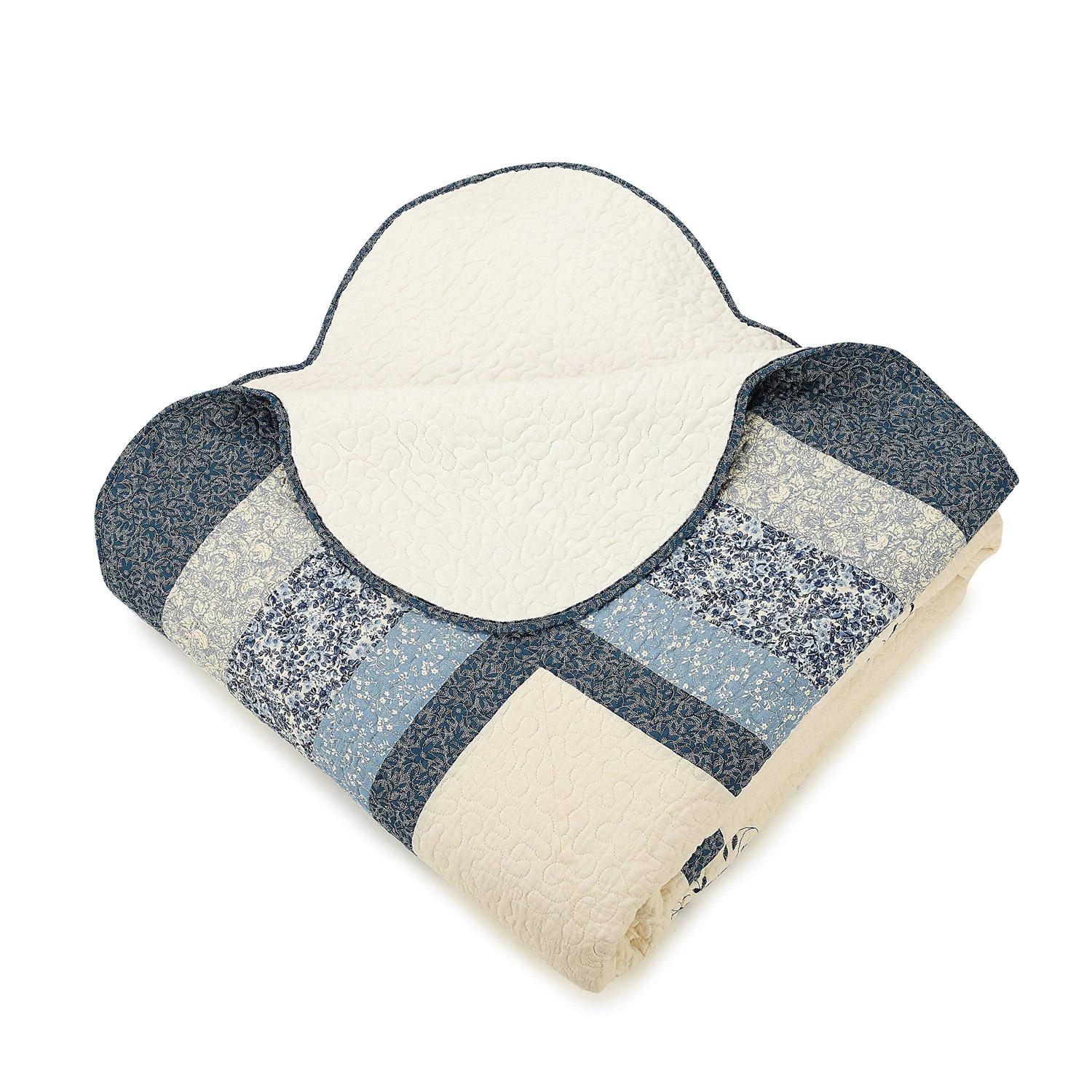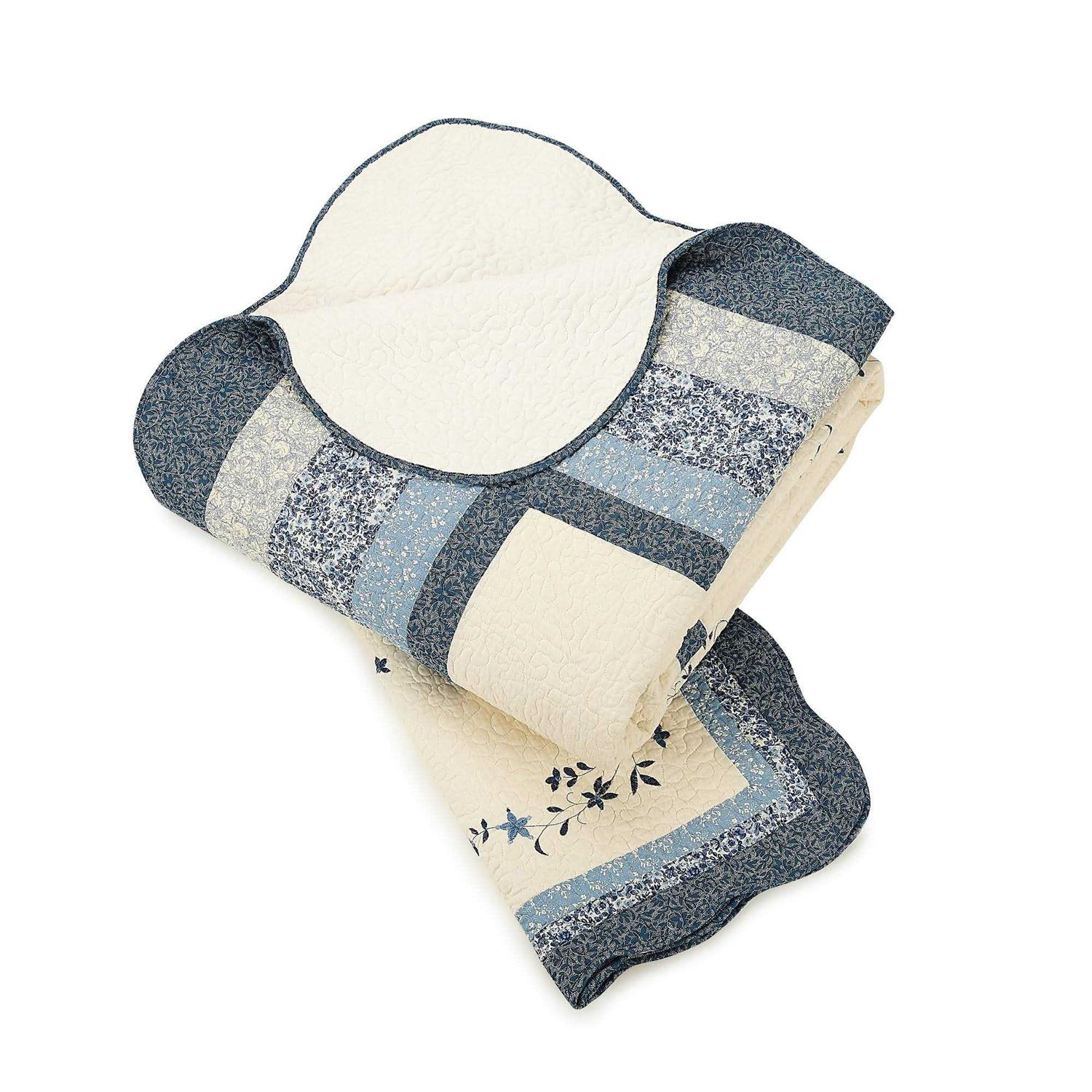 Bring a decorative focal point to your room with this pieced dahlia bedspread. Embroidered blue floral scrolls frame the radiating center pieced dahlia. Floral prints in deep blues make up the border. A gentle scalloped edge gives this bedspread a soft detail. Intricate vermicelli quilting covers everything beautifully. 100% cotton face and fill with a brushed polyester backing. Standard 100 by OEKO-TEX certified. Imported China.