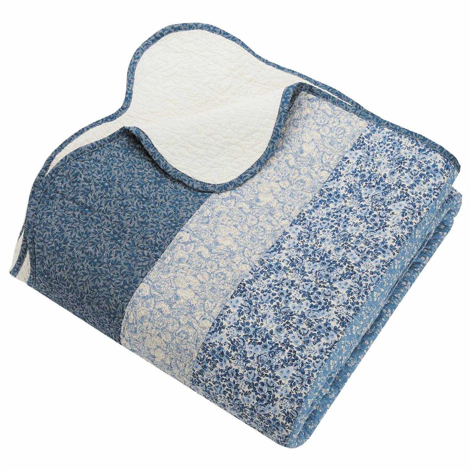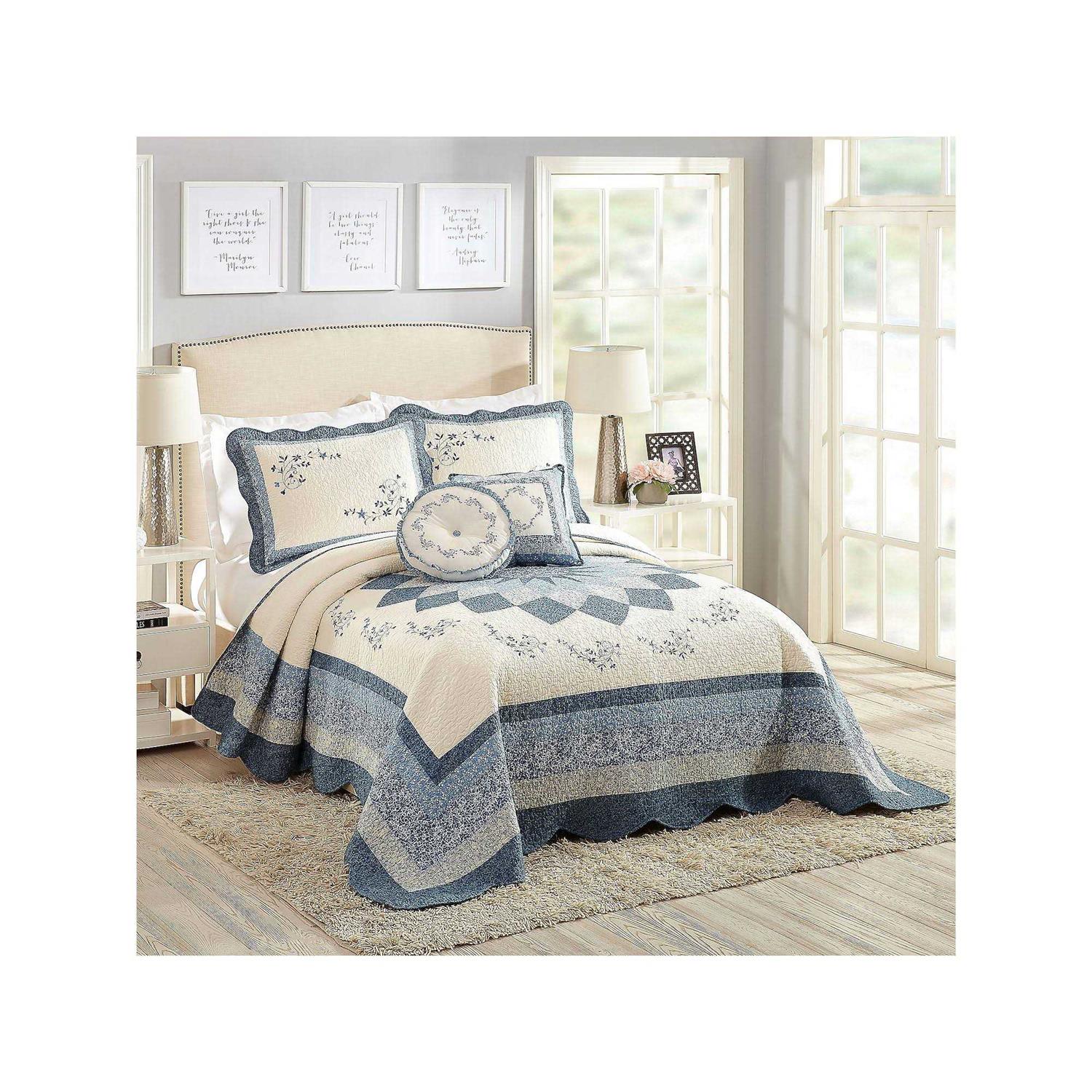 Bring a decorative focal point to your room with this pieced traditional dahlia design bedspread. Embroidered blue floral scrolls frame the radiating center pieced dahlia design. Floral prints in shades of blue make up the border. A gentle scalloped edge gives this bedspread a soft detail. Intricate vermicelli quilting covers everything beautifully. 100% cotton face and fill with a brushed polyester backing. Bedspread size 96 in. x 110 in.