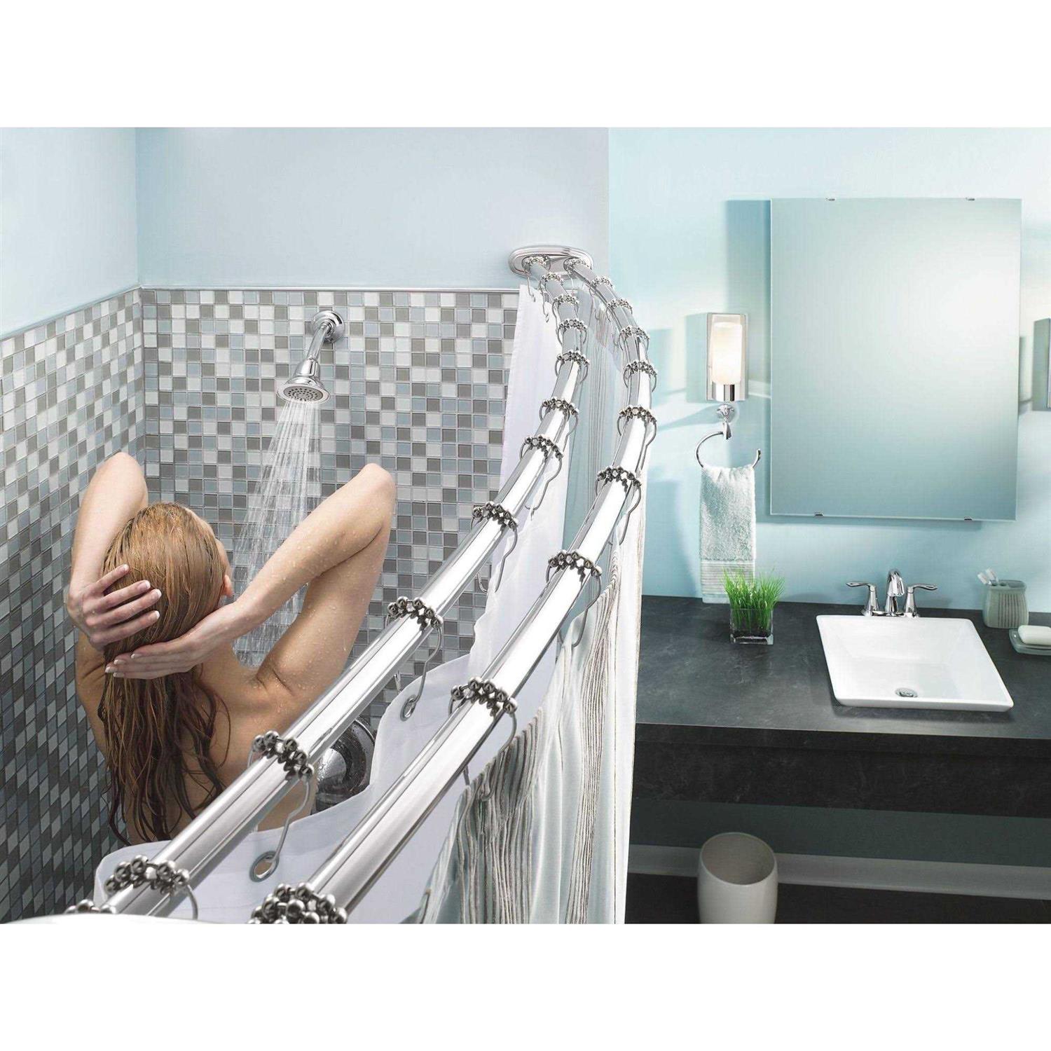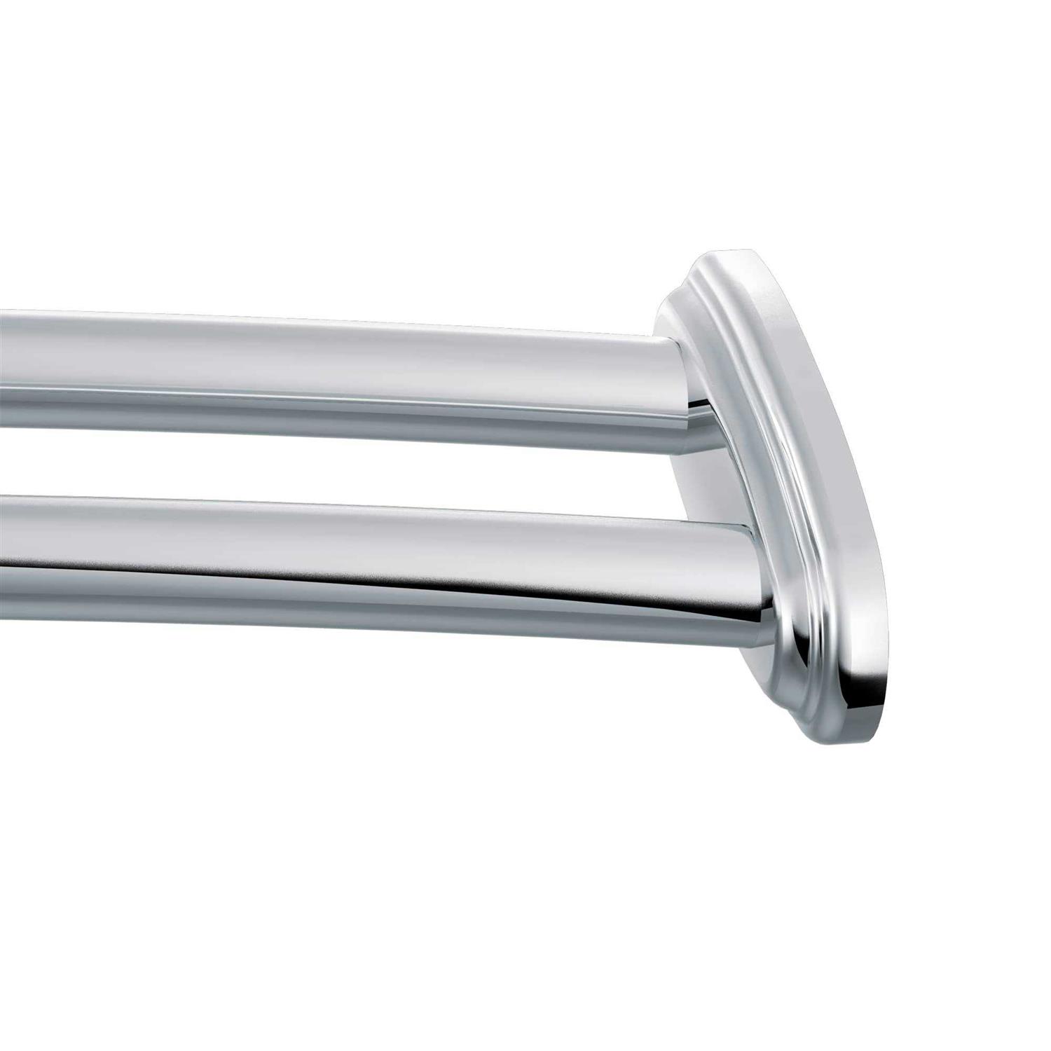 Chrome finish shower curtain rod features a curved design that provides extra elbow room for a more spacious shower experience. Double rods allow you to separate the decorative curtain from the shower liner to prevent mildew, or you can use the extra rod to hang towels and other items. Chrome finish is highly reflective for a mirror-like look that will enhance any style of decor. Stainless steel construction is corrosion-resistant for long-lasting reliability. Works with standard 72-in x 72-in shower curtains, so you can freshen your space with a crisp white curtain or a modern design. Decorative covers are included to stylishly conceal the mounting hardware. Coordinate with other chrome finish fixtures for a cohesive look.