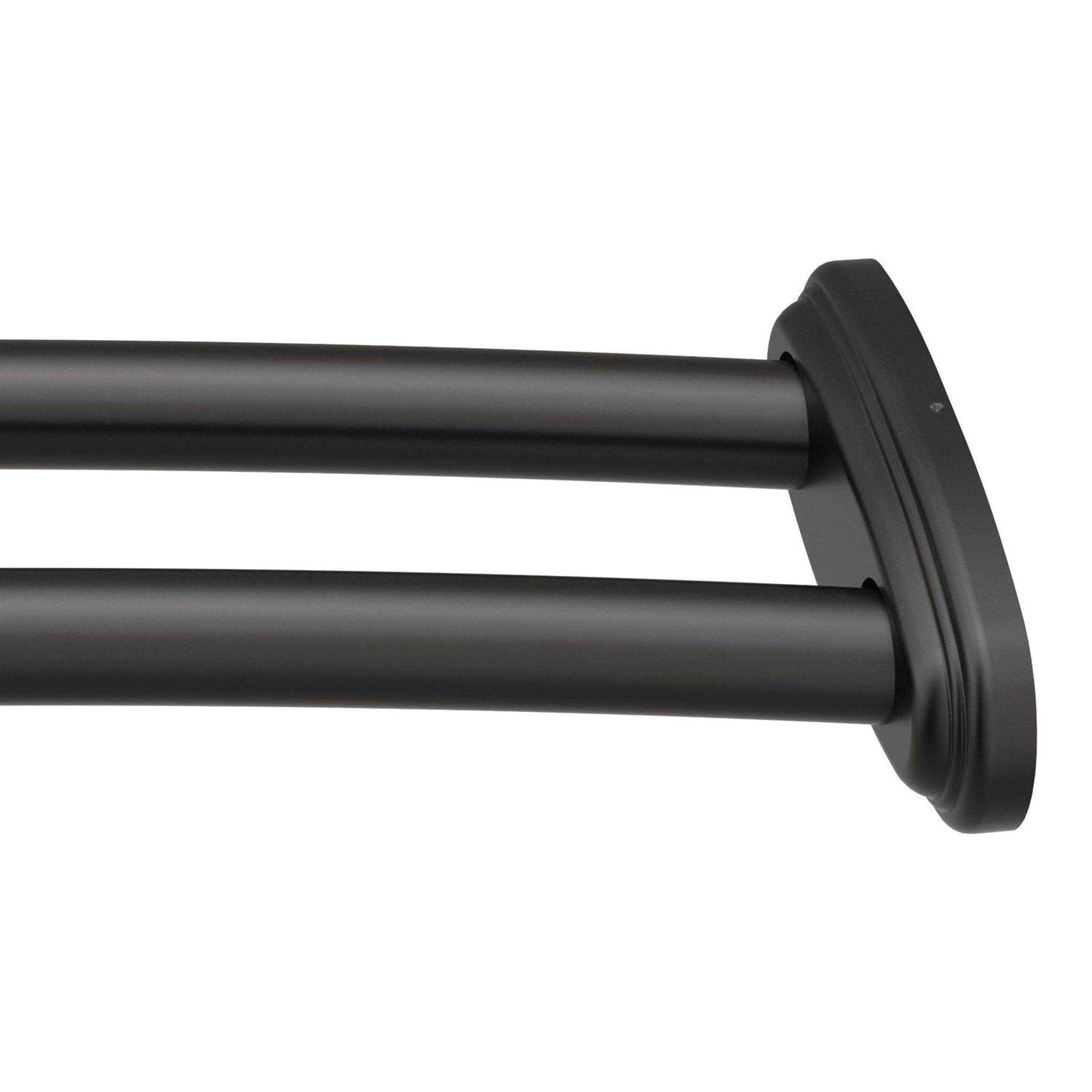 Matte black finish is the perfect complement to modern spaces. Fits standard 72-in x 72-in shower curtains. Shower rod adjusts up to 5-ft for a more flexible installation. Corrosion resistant. Provides extra elbow room in the shower. Features decorative covers that provide a stylish element while also helping to conceal the mounting hardware. Shower curtain ring works with standard shower curtains. Shower curtain ring allows you to separate the decorative curtain from the shower liner. Provides more room for hanging towels and other items.