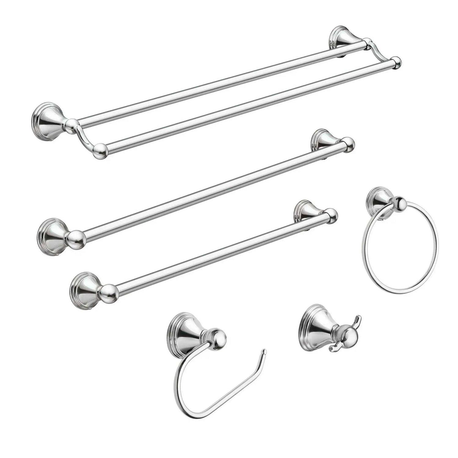 With its simple, low-key design, the Moen Preston 24-Inch Bathroom Double Towel Bar adds a touch of understated style to your bathroom. Two sturdy bars offer ample space for multiple towels, washcloths, and other items. A stamped steel mounting bracket enhances durability, while the included mounting hardware and template make installation easy. The Preston Double Towel Bar features a highly reflective chrome finish for classic style that blends in with any bathroom decor.
