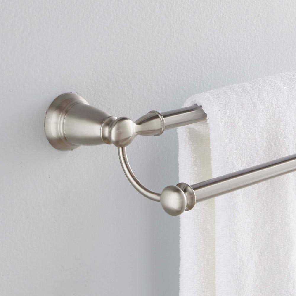 Design your dream bathroom with this MOEN Banbury Collection Towel Bar in Brushed Nickel. This towel bar is designed with a simple style, making it a classic piece for your bathroom. It is coated with brushed nickel, making it both a decorative and durable fixture. It includes mounting accessories for easy installation. This towel bar is made of zinc, making it both a lightweight and strong choice for your space. Zinc is typically environmentally-friendly, reducing your total carbon footprint. This towel bar is spot-resistant, prevents smudges from sticking to the metal surface, so it will stay sparkling.