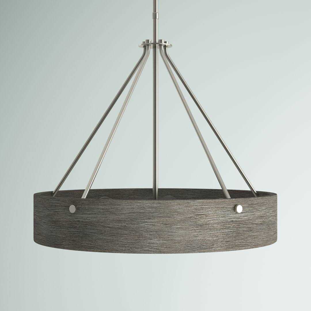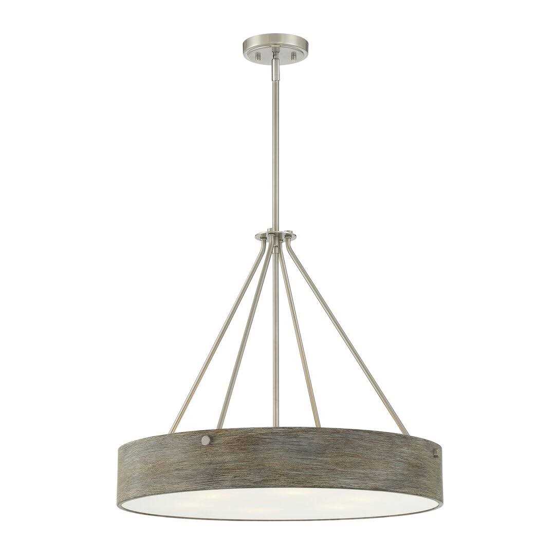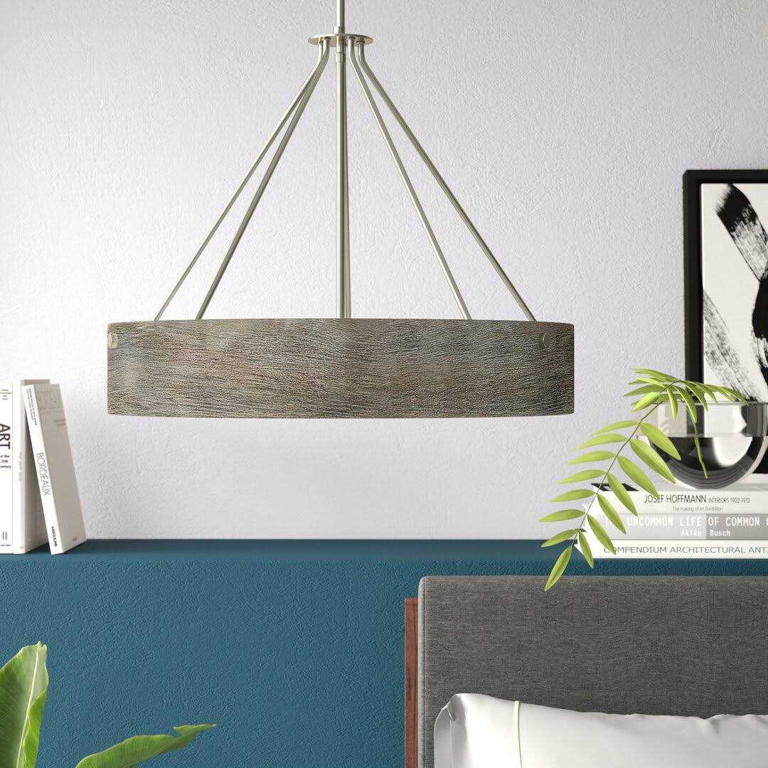 This 6-light pendant fixture brings sleek style and a geometric silhouette to your entryway or dining room. It’s made from metal with a neutral finish, and it has an engineered wood shade for a mixed-materials look. This fixture has a circular canopy, a slim cylindrical downrod, and five diagonal arms suspending a streamlined drum shade. Five standard bulbs (sold separately) sit within the shade, illuminating your space with ambient light. Best of all, this versatile pendant light is height adjustable, dimmer-switch compatible, and sloped-ceiling adaptable.