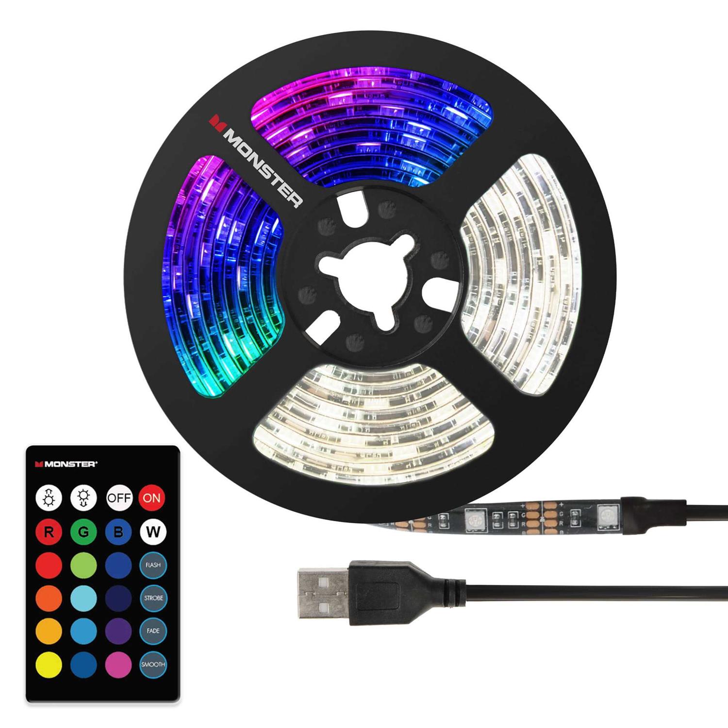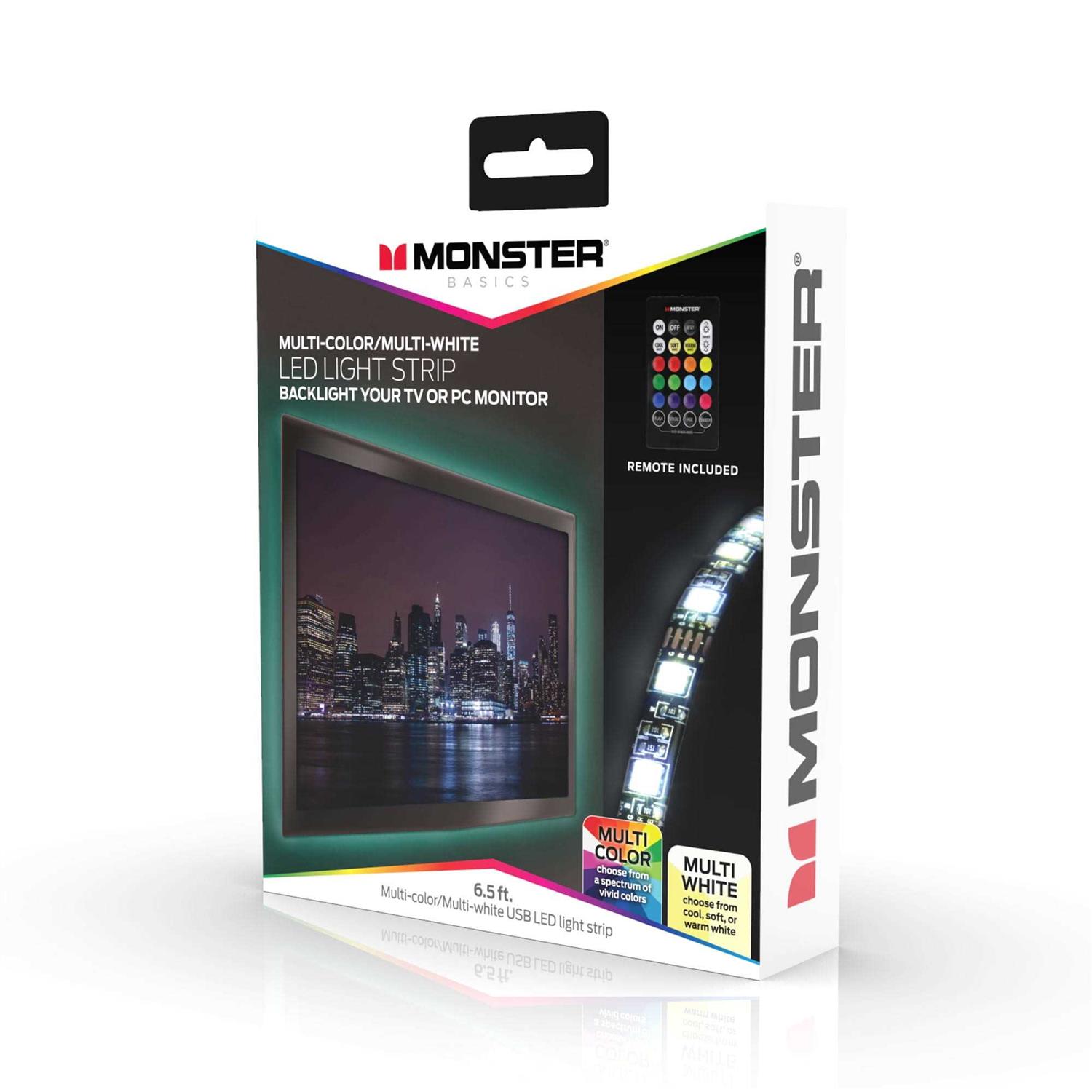 With the Monster Multi-Color/Multi-White LED Light Strip, you can transform any indoor and outdoor space into a vibrant array of color and light. At 16.4 ft, youll be able to use it in a whole variety of locations. Decks, Walkways, Gardens, Kitchens, Bedrooms, Offices, All could benefit from a little extra color. The multiple Multi-White and Multi-Color shades allow you to create customizable light settings alongside unique speeds which transition between your various creations. The 8-foot adapter cable can reach from an outlet to the strips final location without issue. Our waterproof design is perfect for outdoors and is safe in a variety of wet environments. Add a little color and light to your location with the Multi-Color/Multi-White LED Light Strip.