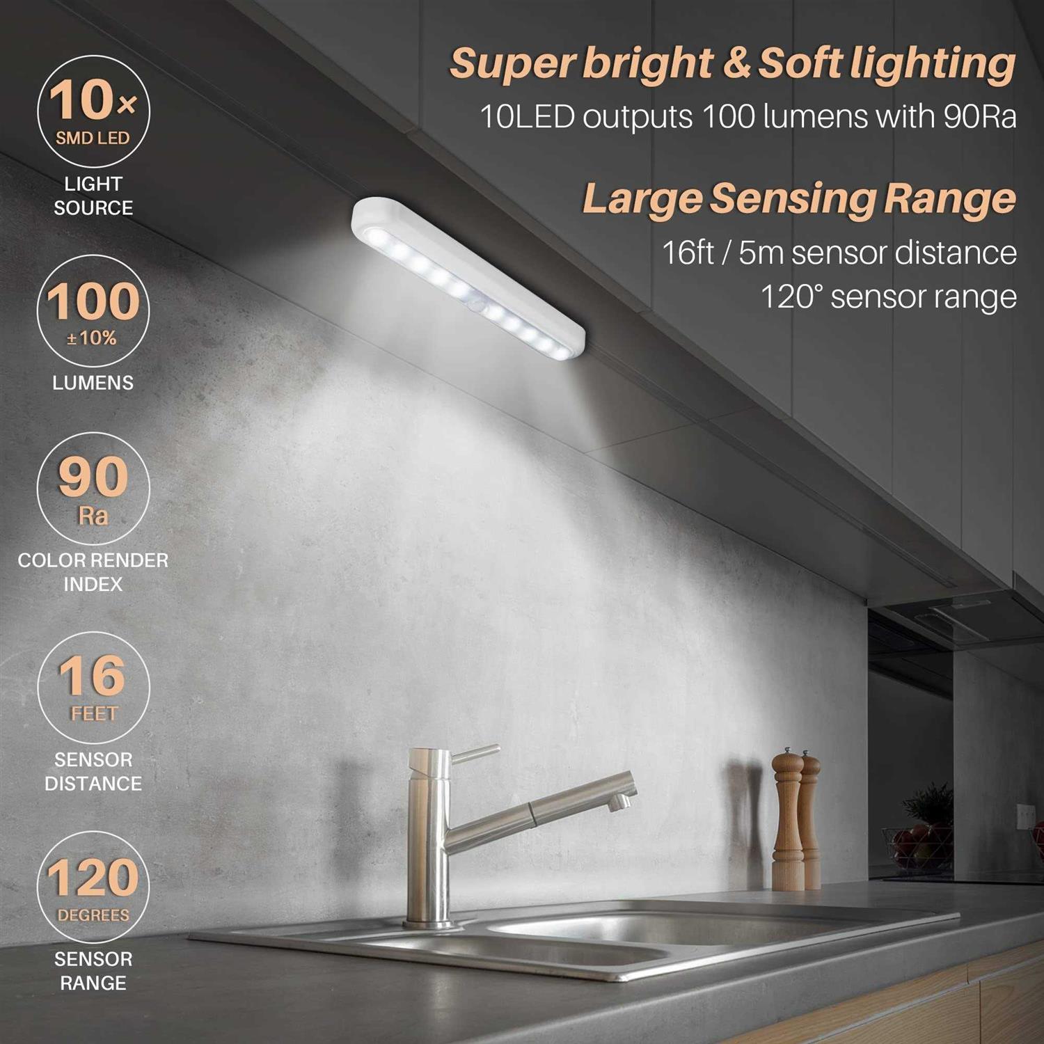 It is powered by 3 or 6pcs AAA battery (Not included) and features 10pcs super bright SMD LED that brings 100% brightness to you in the dark condition. This Motion Sensor LED Light will auto turn on when a movement is detected in the dark. It will auto turn off after 20 seconds without any movement. Compact and portable size makes it ideal for anywhere you need extra light to stick on like kitchen, bedroom, hallway, stairs, basement, attic, garage, laundry area, under cabinet, closet, wardrobe, cupboard, drawer, safe box, mailbox and more. Feature: Good quality lights, long-life time for daily use. Compact portable size make it an ideal dependable lighting for emergencies. 100 lumens, auto turn on when a movement is detected in the dark, auto turn off after 20 seconds without any movement. Mainly designed for small dark places. Energy-efficient LED, no bulbs to replace. Easy to stick up with Customized Super Strong Adhesive Tape (included). Ideal for kitchen, bedroom, home bar, hallway, stairs, garage, laundry area, basement, attic, garage, under cabinet, closet, cupboard, wardrobe. Specification: Power Supply: 3/6 AAA batteries (NOT included) Material: ABS, PS Light Source: 10pcs 0.5W SMD2835 LEDs Light