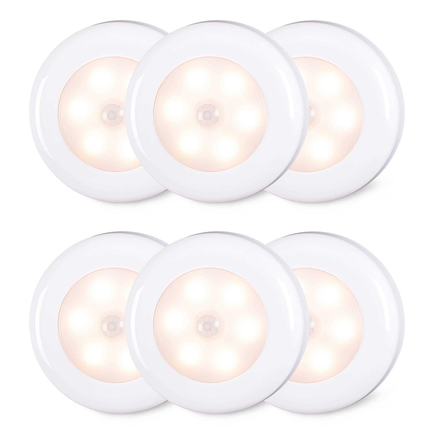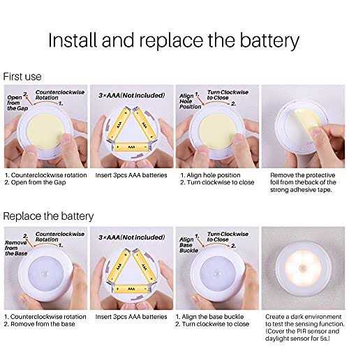 【MOTION SENSOR & LIGHT SENSOR】 With passive infrared technology (PIR), it detects human motion. Automatically turns on in the dark. The motion sensor closet lights is auto-on within 16 feet, auto-off after 20 seconds with no motion. To save battery life, these smart lights won’t turn on if there’s already light in the area. 【SUPER BRIGHT & SOFT LIGHTING】 Up to 60 lumen output, 6 pcs super bright 0.5W SMD 2835 LED with 90Ra. These cordless motion sensor under cabinet lights provide enough light to make sure you never stumble in the dark. Adopt advanced anti-glare panel, provide soft light to protect your eyes, better for kids and elders. 【BATTERY OPERATED & EASY INSTALLATION】 With customized super strong adhesive tape, stick on anywhere you want, no hard-wiring. These night step lights are powered by 3 AAA batteries (not included). Light does not switch on if there’s enough light in the area. This saves battery life for a long time. 【PORTABLE DESIGN & WIDE APPLICATION】Compact and portable size makes these motion sensor puck lights ideal for anywhere you need extra light to stick on like kitchen, bedroom, hallway, stairs, basement, attic, garage, laundry area, under cabinet, closet, cupboard, drawer, safe box, mailbox, etc. – ol li It has Motion Sensor, Light Sensor and Auto-delay function. /li li Large Sensing Range, 16ft sensor distance, 120° sensor range. /li li High CRI & bright LEDs output 60 lumen with 90Ra. /li li Milky LED panel with gentle lighting to protect your eyes. /li li Each powered by 3 AAA batteries, no wiring needed. /li li 2.76″ Mini portable size, perfect for adding light anywhere. /li li Simple to install with strong adhesive tape (included). /li li Ideal for Closet, Cabinet, Wardrobe, Kitchen, Bedroom, Bathroom, Hallway, Stairs, Laundry area, Locker, Drawer, Dollhouse, Safe box, Mailbox. /li /ol p strong Warning: /strong – ol li With Light Sensor, it ONLY turns ON when movement is detected in the DARK. /li li With Auto-delay function, it ONLY turns OFF in 20s after detecting your LAST movement. /li li When the battery is inserted, it will light up briefly and then turn itself off to indicate that it is WORKING. /li /ol strong Specification: /strong br / ul li Power supply: 3 x AAA batteries (Not included) br / /li li Light source: 6 x High Bright LED /li li Luminous flux: 60 lumens br / /li li Light CCT: 3000K br / /li li Light CRI: 90 Ra br / /li li Light sensitive: <20 LUX br / /li li Sensor distance: 16 ft / 5 m br / /li li Sensor range: 120° br / /li li Sensor time: 20s (Auto-delay) br / /li li Product size: 2.7×2.7×1.0 inch br / /li /ul strong Package Includes: /strong br / ul li 6 x LED Motion Sensor Light with New Strong Adhesive Tape /li li 1 x User Manual /li /ul