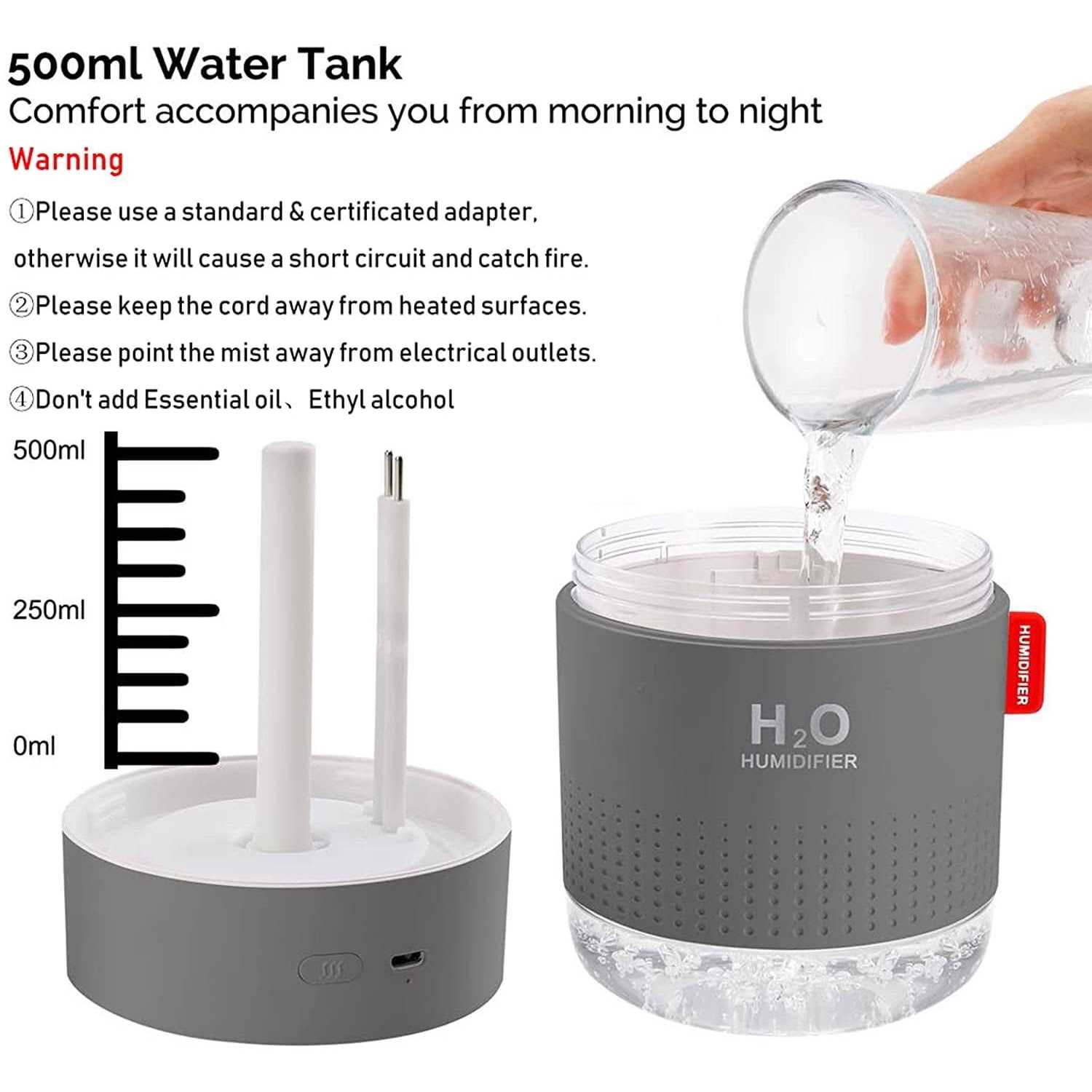 Brand: MOVTIPColor: GrayFeatures: 【PORTABLE MINI HUMIDIFIER】 Portable and small design is very easy take with you anywhere and super perfect for travel,bedroom,office, which is effectively moisturize dry skin and help you reduce skin peeling. 【TWO MIST MODES】 This mini humidifier has two modes. When you press the button first time, it will continuously spray for 12 hours. When you press again and it will intermittently spray (stop 2 seconds) for 18 hours. 500ml large capacity produces longer mist. 【SAFE & AUTO SHUT-OFF】 There is built-in water level sensor inside that will automatically turn off the power when the water is lower than the safe water level. And the seal is strong,no longer afraid of pouring liquid to leak in accidence. 【ONE BUTTON CONTROL】 The portable usb humidifier is very easy to operate. One button controls for all functions, you simply need to press one button to set the mist. Make your life easier! 【KIND REMINDER】 1 Do not use essential oils,perfume, distilled water, which will cause the cotton swab to clog and the Humidifier to be unusable. 2Please make sure the cotton core has soaked a few minutes before you turning it on. 3Any quality problem, please do feel free to email us. Binding: KitchenDetails: Specification: -Material: ABS + silicone + PC + metal + electrical components -Water tank: 500 ml -Size: 95 * 95 * 129mm *Color: white / pink / gray / blue -Power: 1.5-2 watts -Voltage: DC5V -Amount of fog: 30-50 ml / hour -Working time: 12-18 hours Feature: 1. Package Includes: 1 X portable humidifier 1 X USB cablePackage Dimensions: 5.3 x 3.9 x 3.9 inches