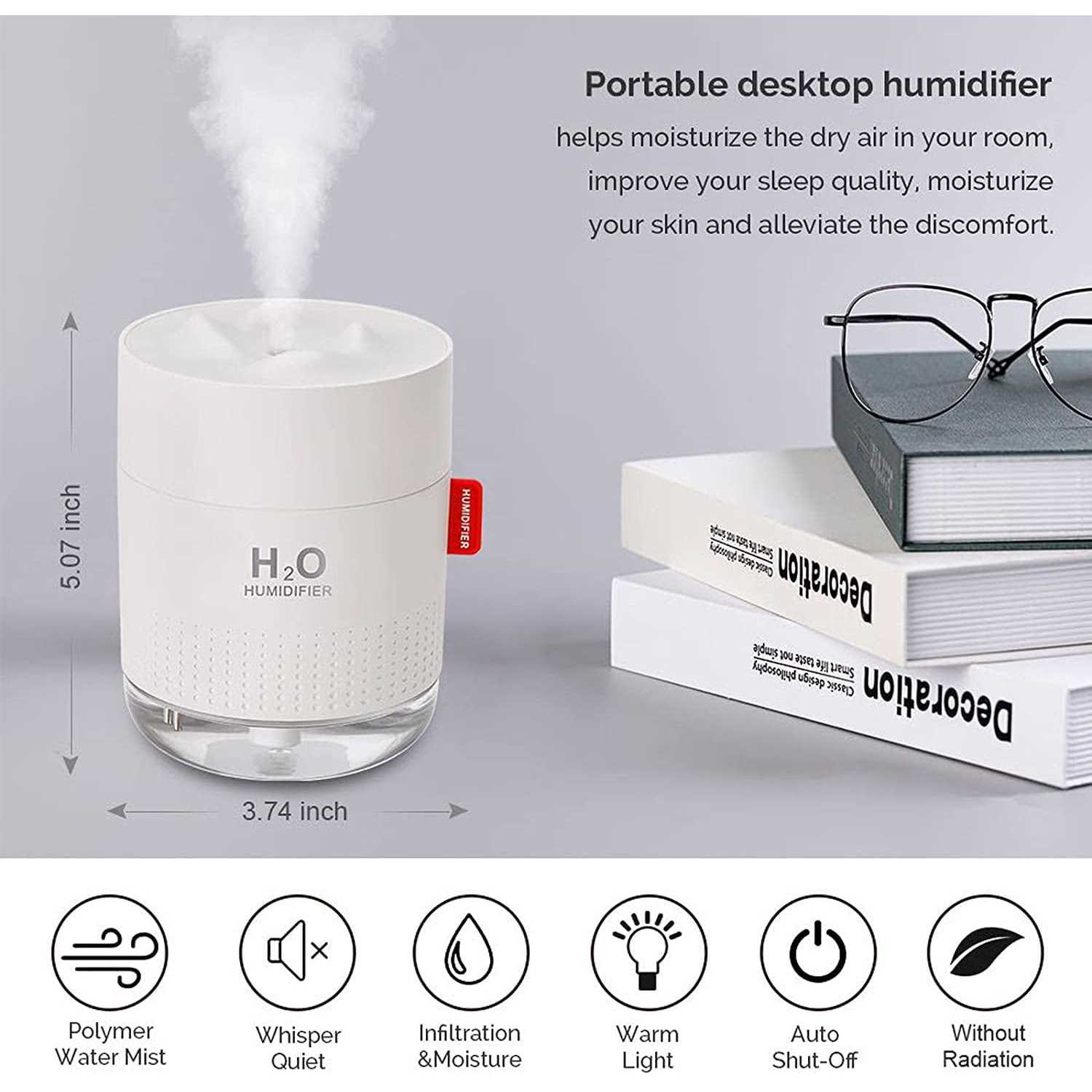 PORTABLE MINI HUMIDIFIERPortable and small design is very easy take with you anywhere and super perfect for travel,bedroom,office, which is effectively moisturize dry skin and help you reduce skin peeling. TWO MIST MODESThis mini humidifier has two modes. When you press the button first time, it will continuously spray for 12 hours. When you press again and it will intermittently spray (stop 2 seconds) for 18 hours. 500ml large capacity produces longer mist. SAFE & AUTO SHUT-OFFThere is built-in water level sensor inside that will automatically turn off the power when the water is lower than the safe water level. And the seal is strong,no longer afraid of pouring liquid to leak in accidence. ONE BUTTON CONTROLThe portable usb humidifier is very easy to operate. One button controls for all functions, you simply need to press one button to set the mist. Make your life easier! International products have separate terms, are sold from abroad and may differ from local products, including fit, age ratings, and language of product, labeling or instructions.