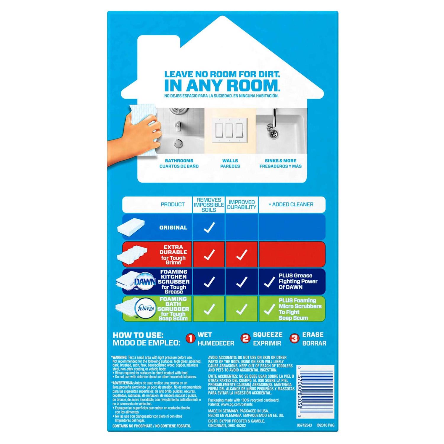 Brighten up your home by helping to renew its surfaces. Mr. Clean Magic Eraser Original will help your walls, baseboards, floors, switch plates, blinds and more look like new again by easily removing scuff marks and dirt. To discover the cleaning possibilities, simply take a swipe. Its water-activated micro-scrubbers reach into the surface grooves, lifting away built up grease and soap scum. The Mr. Clean Magic Eraser Original is so powerful that each swipe removes more grime than the leading all-purpose spray cleaner, and it has no harsh chemicals. Before long, you’ll be back to the things you love best in a brighter, cleaner space.