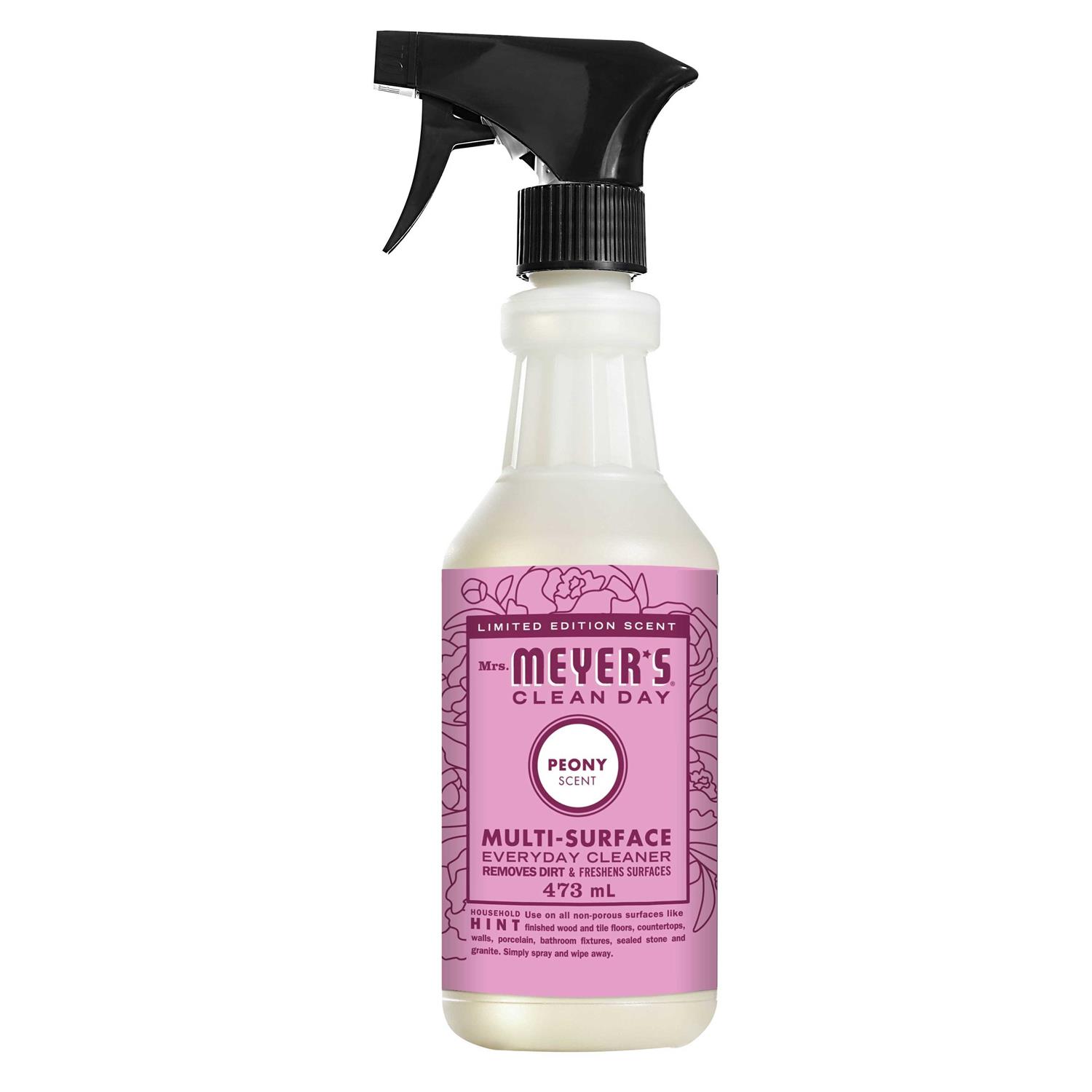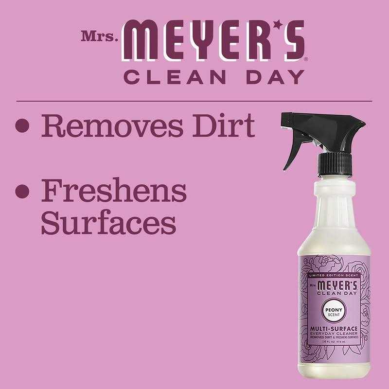 Quick and easy multi surface spray removes stuck on dirt A fresh way to clean, refresh, and remove odors from non-porous surfaces throughout the house Garden-fresh peony scented multi-surface cleaner Safe to use as a floor cleaner, tile cleaner, on countertops, walls, and more Mrs. Meyer’s produces cruelty free cleaners. None of our products are tested on animals.